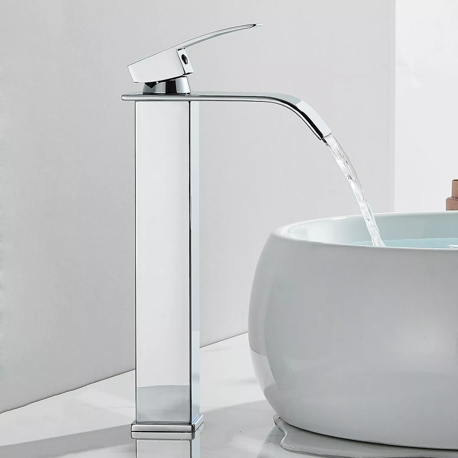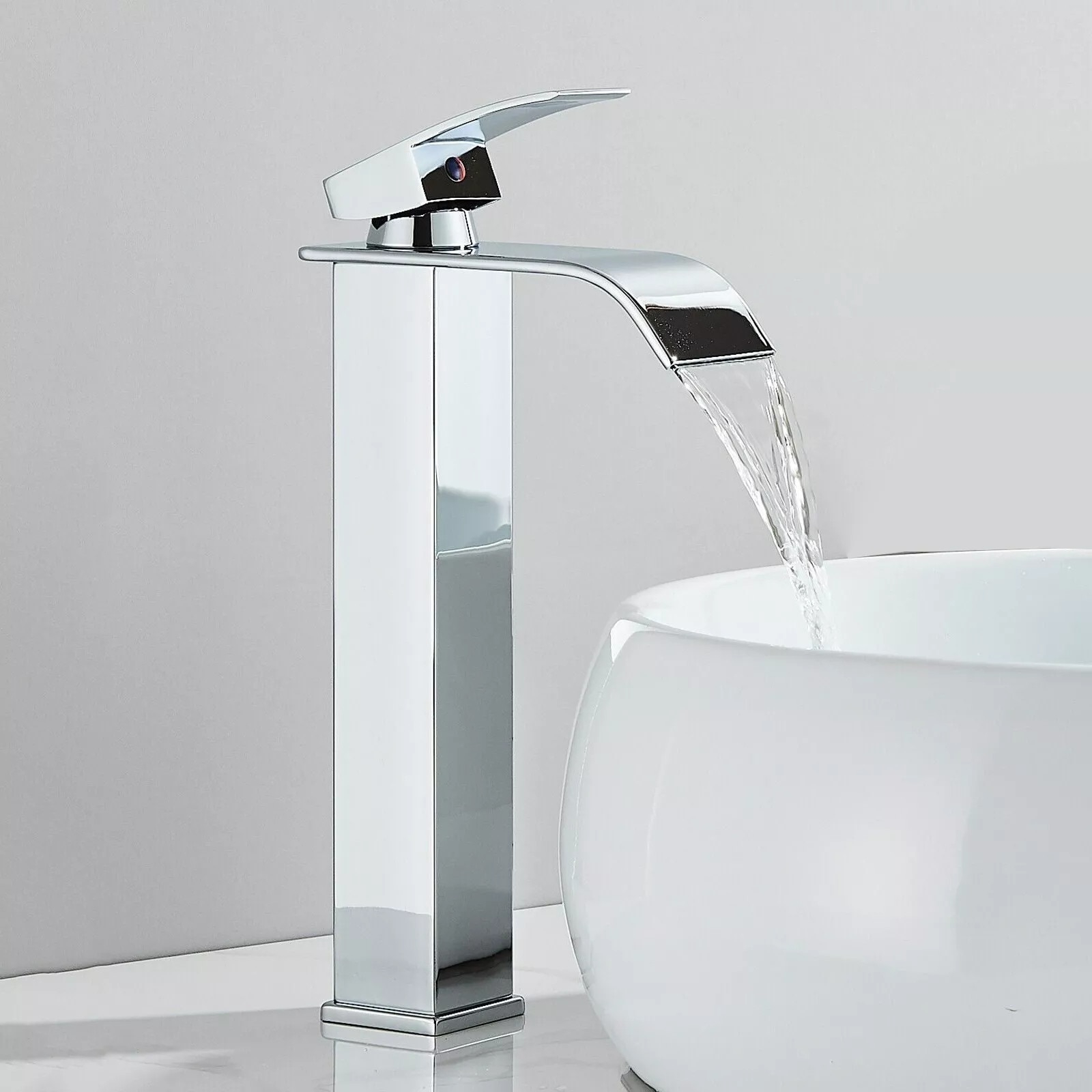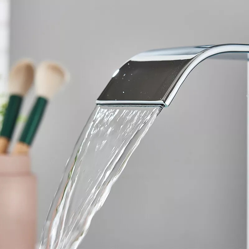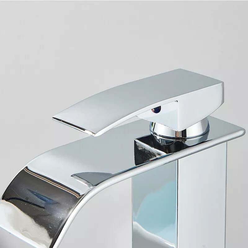 Baterie chiuvetă baie cu pipă tip cascadă și design pătrat, dimensiune de 27 cm, realizată din alamă solidă cu finisaj crom lucios. Oferă control precis al temperaturii, operare cu o singură mână și un flux uniform ce economisește apă.
