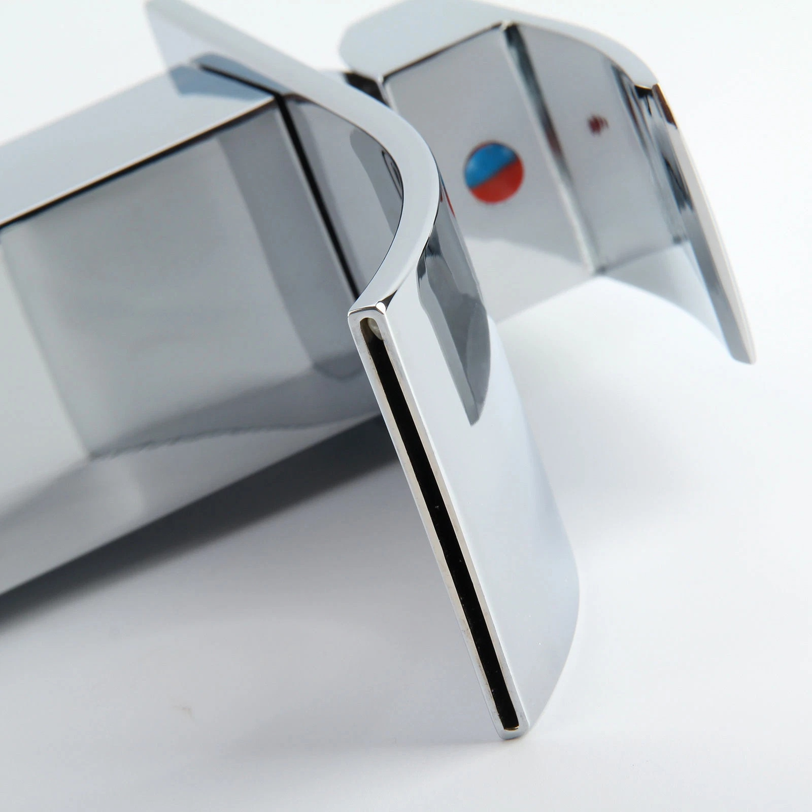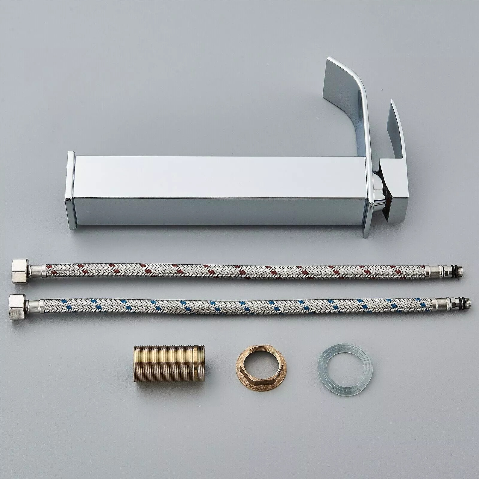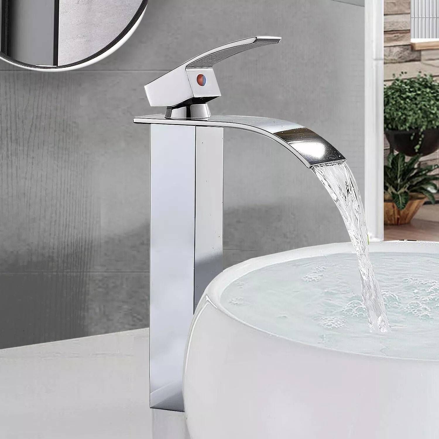 Baterie chiuvetă baie cu pipă tip cascadă și design pătrat, dimensiune de 27 cm, realizată din alamă solidă cu finisaj crom lucios. Oferă control precis al temperaturii, operare cu o singură mână și un flux uniform ce economisește apă.