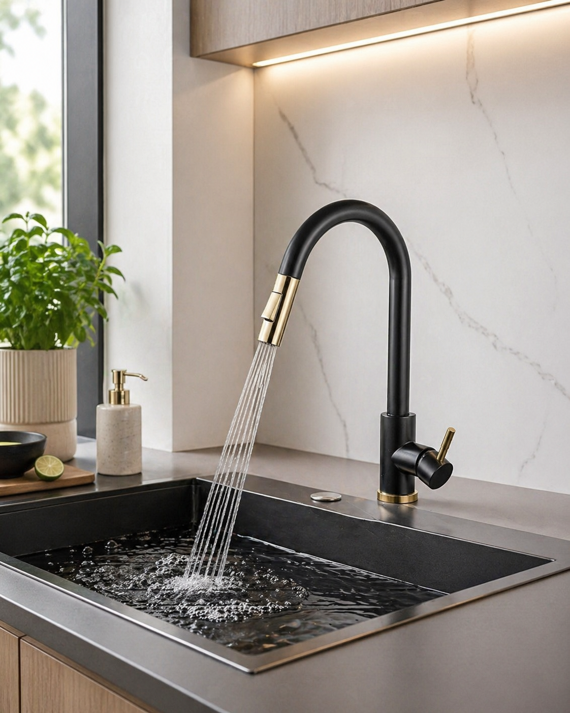 • Finisaj negru mat & auriu – aspect curat, se potrivește ușor în orice bucătărie