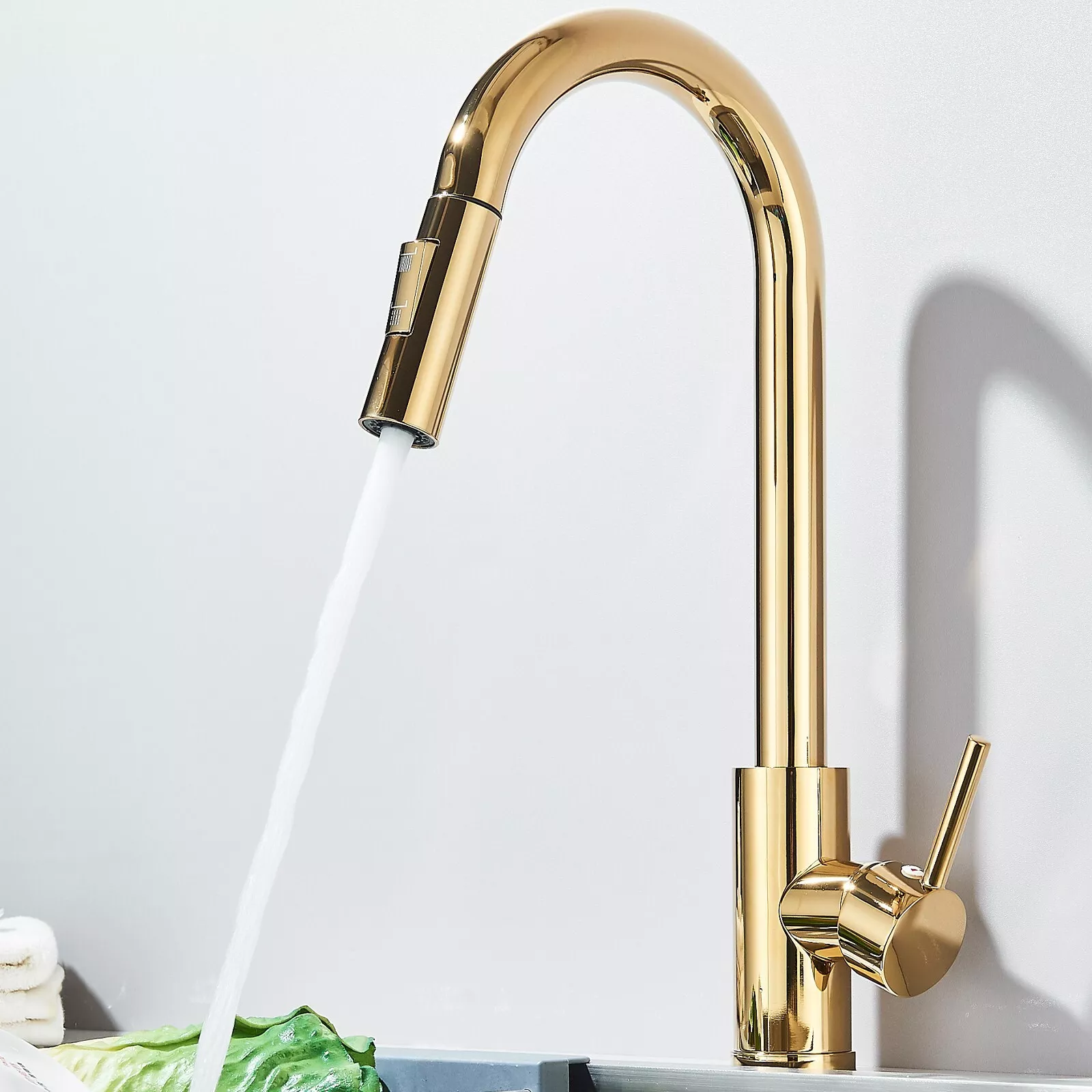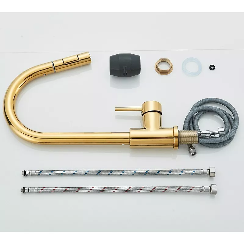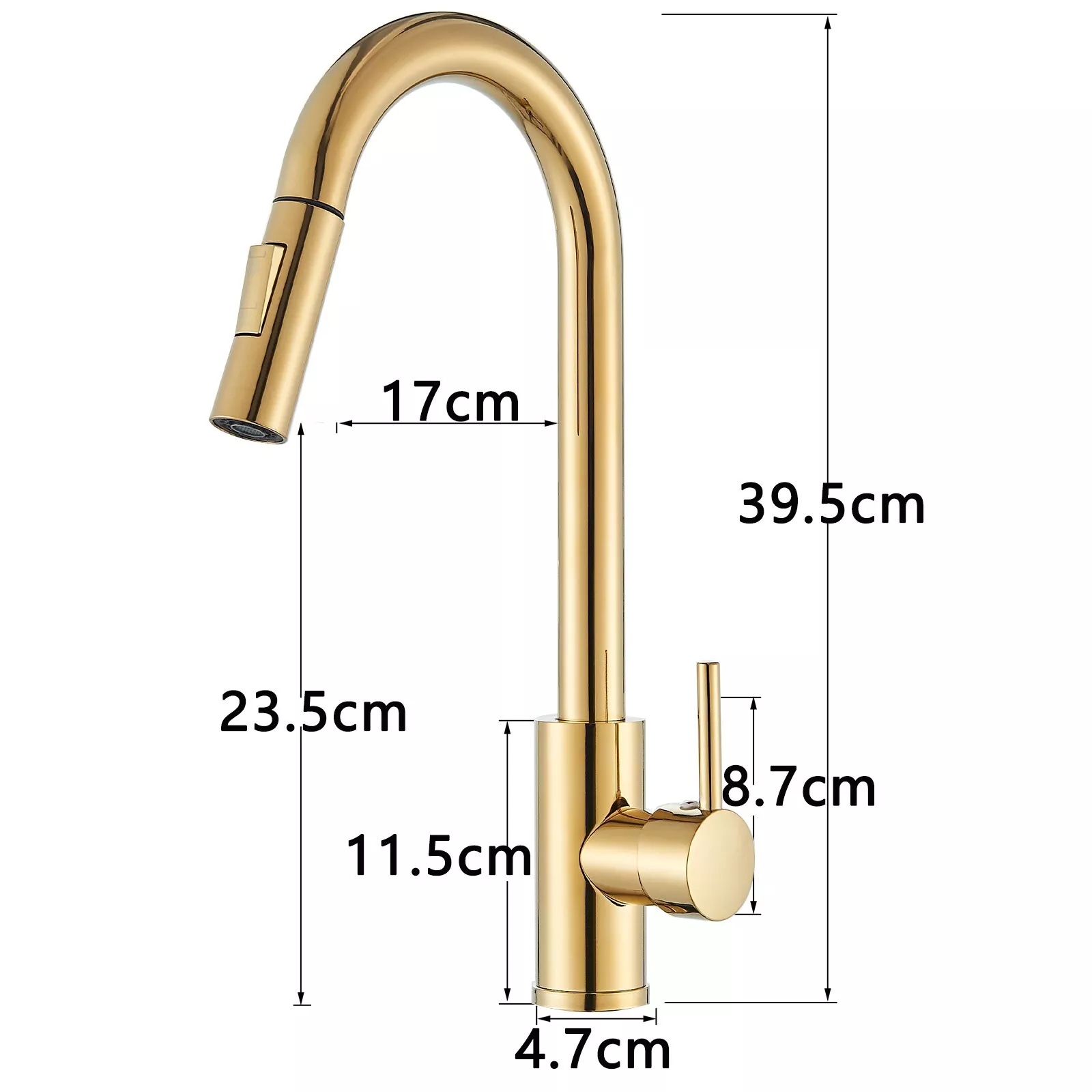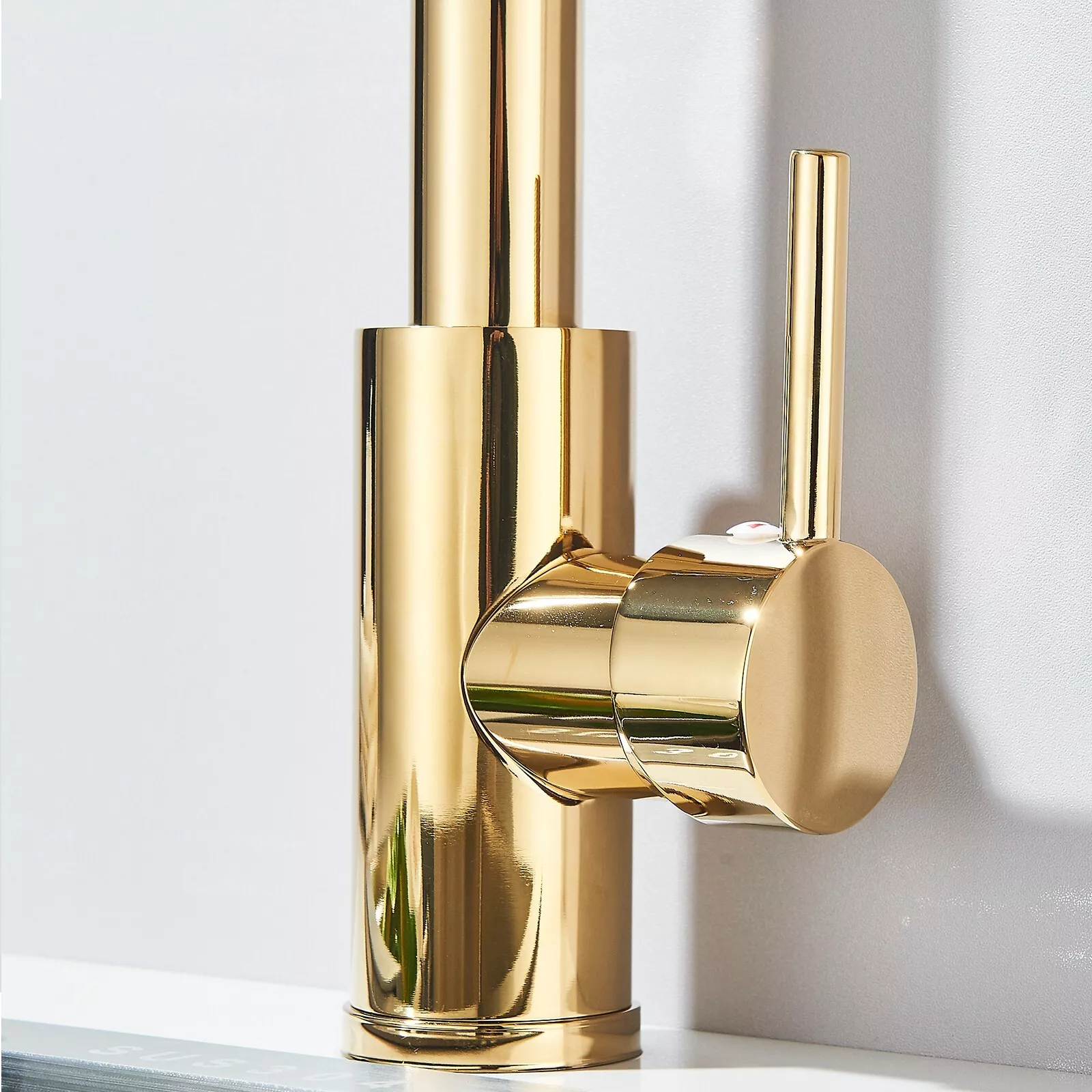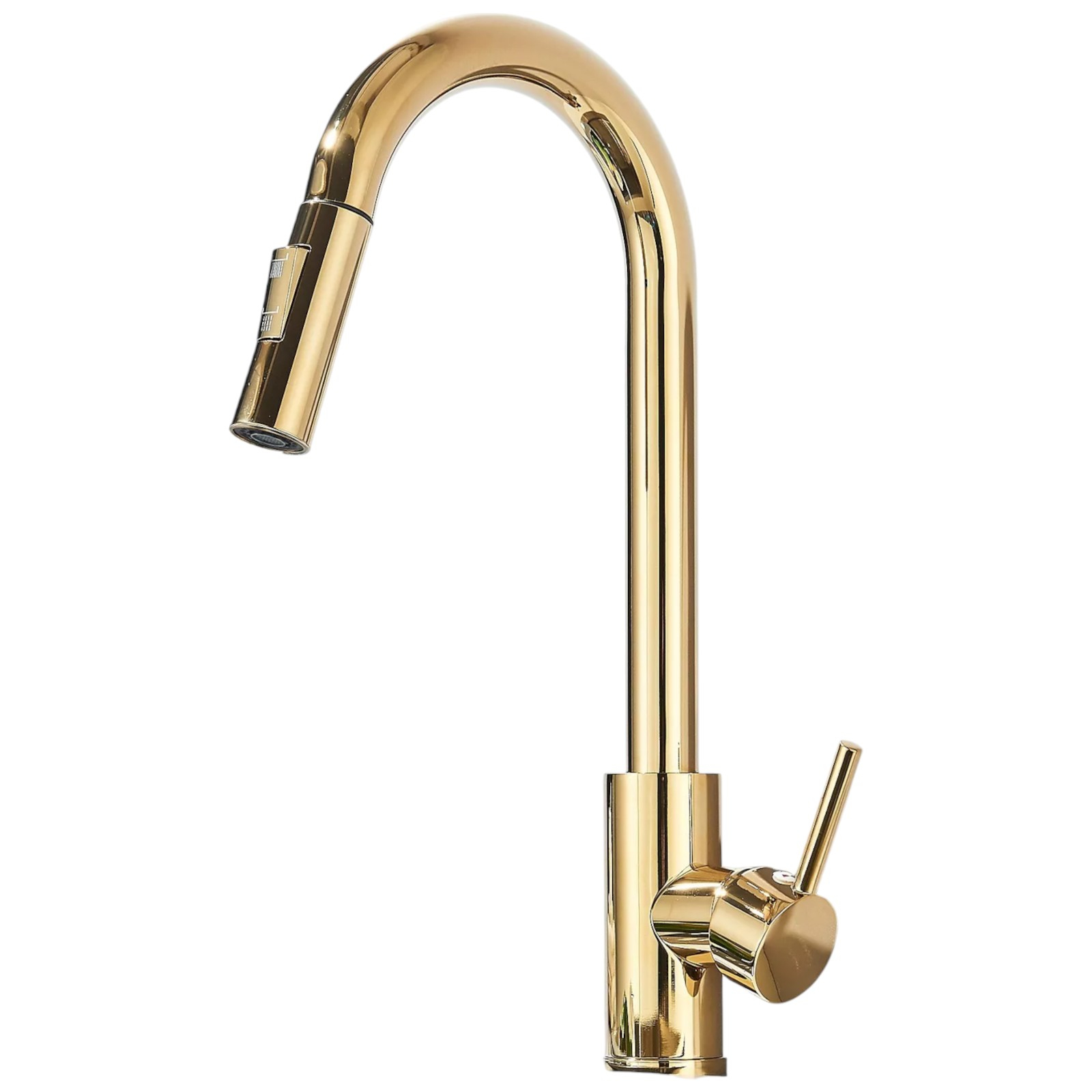 Baterie bucătărie auriu lucios cu duș extractabil, 2 funcții, pipă pivotantă 360°, aerator ABS pentru economie de apă, din alamă solidă cu strat crom anticoroziv.