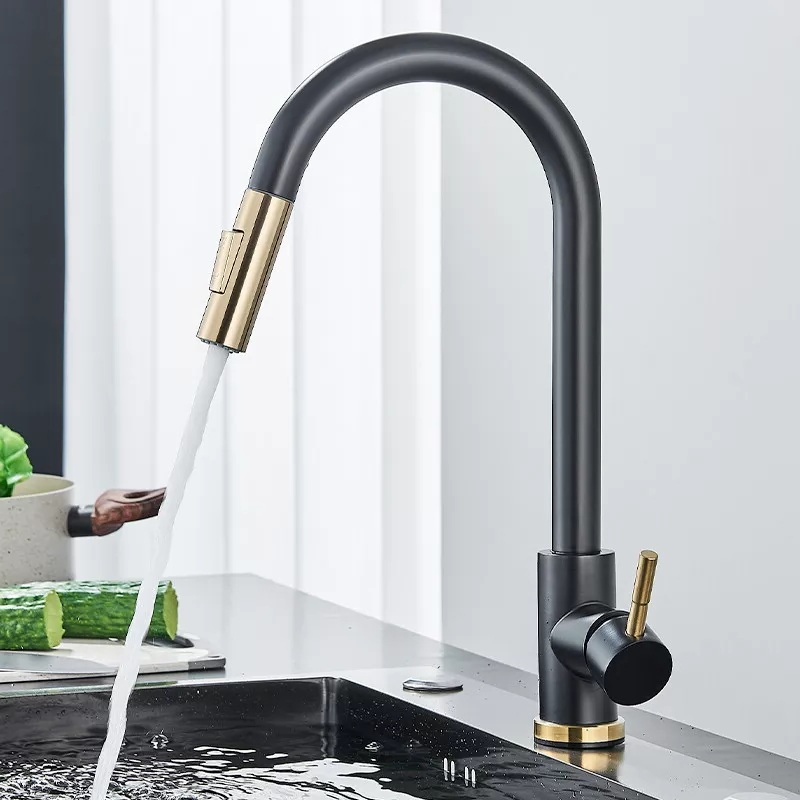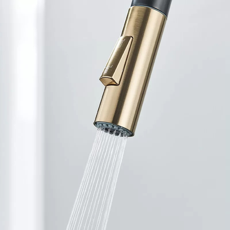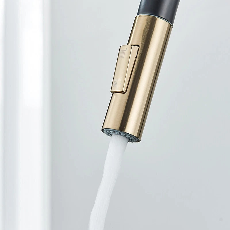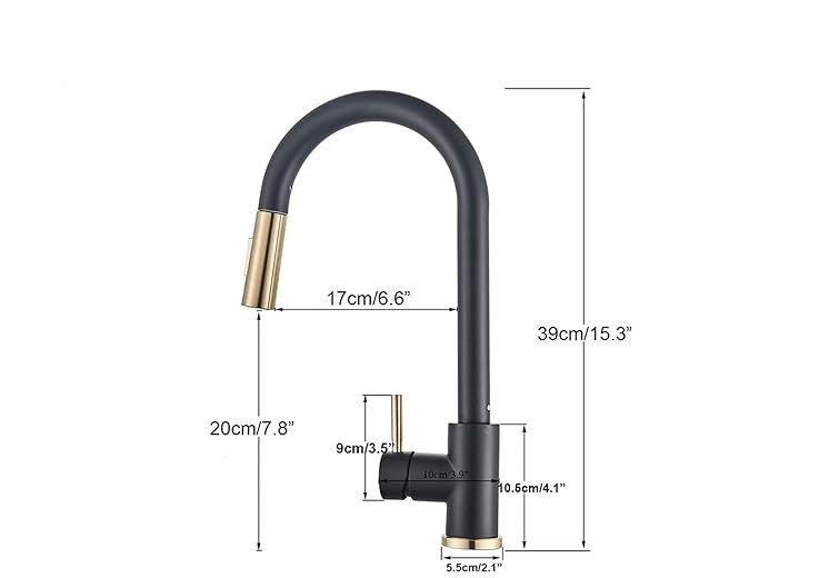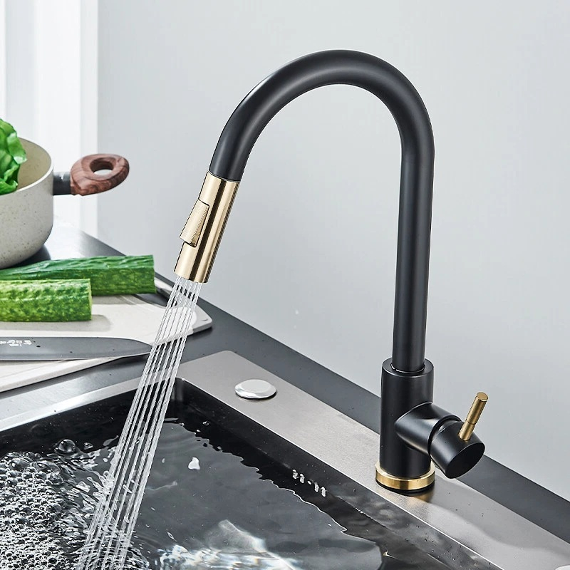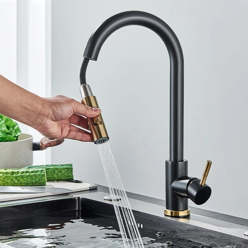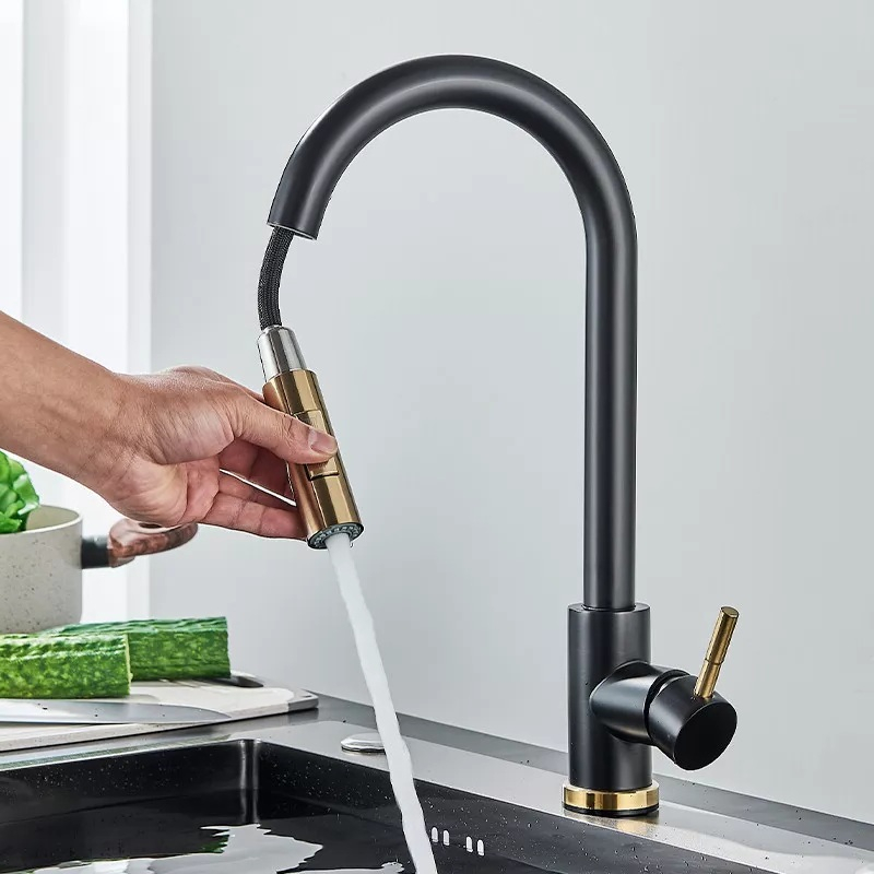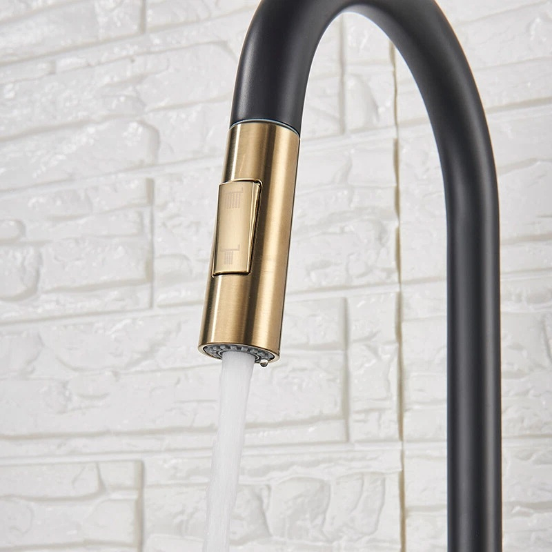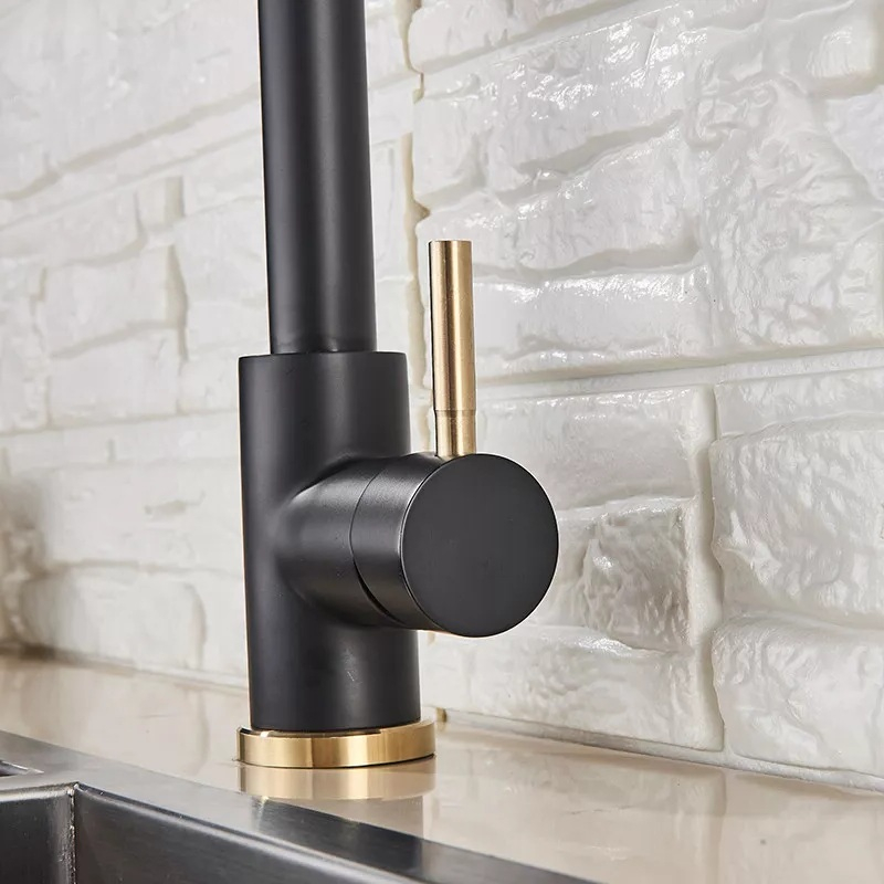 Baterie bucătărie 39 cm, finisaj negru mat & auriu, cu duș extractabil și 2 funcții de curgere. Pipă pivotantă 360° și aerator ABS pentru economie de apă.