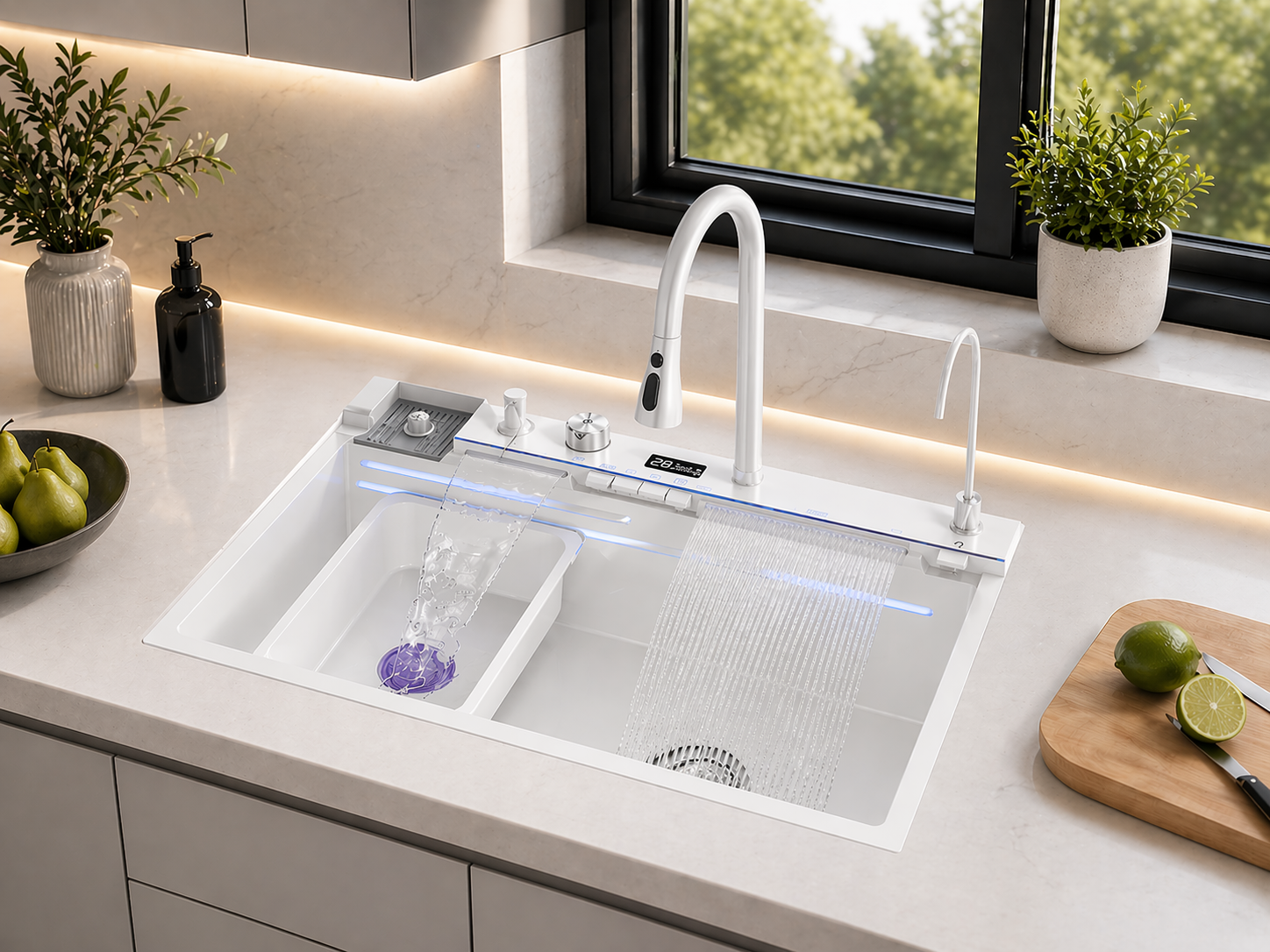 Dotată cu afișaj LCD cu bandă LED, chiuveta îți permite să monitorizezi temperatura apei în timp real. Funcția de duș extractabil adaugă flexibilitate, iar cele două cascade contribuie la o experiență elegantă și versatilă. Bateria pivotantă la 360° și posibilitatea de filtrare a apei completează funcționalitatea de top.