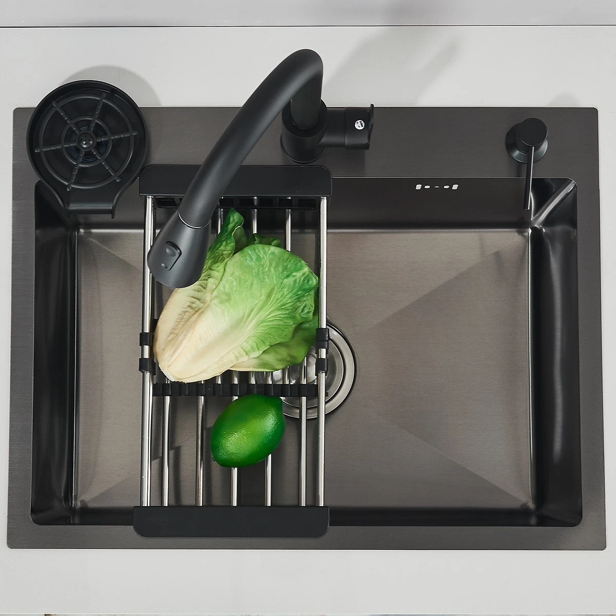 Chiuvetă multifuncțională BisDesign® pentru bucătărie, cu duș extractabil, spălător pahare, dispenser săpun și coș organizator. Material antiaderent și finisaj negru mat.