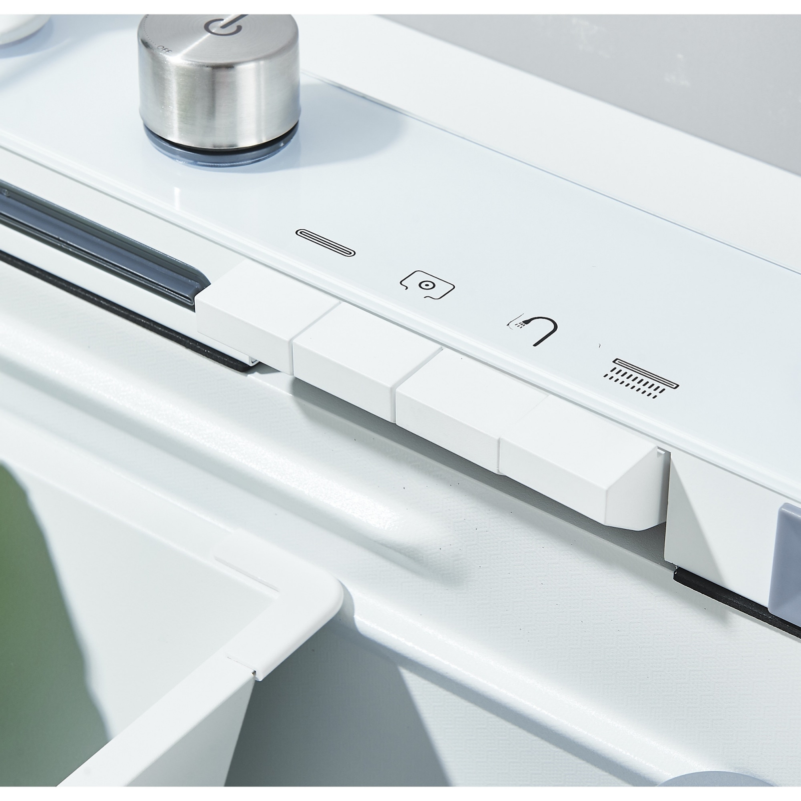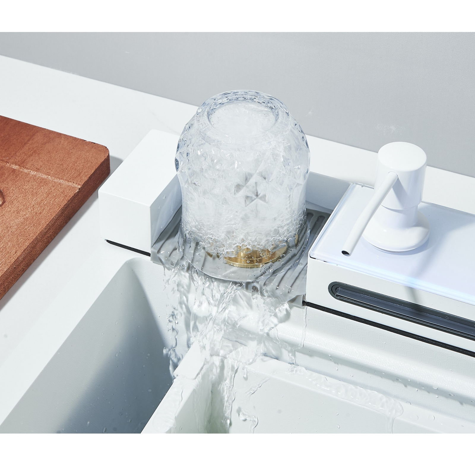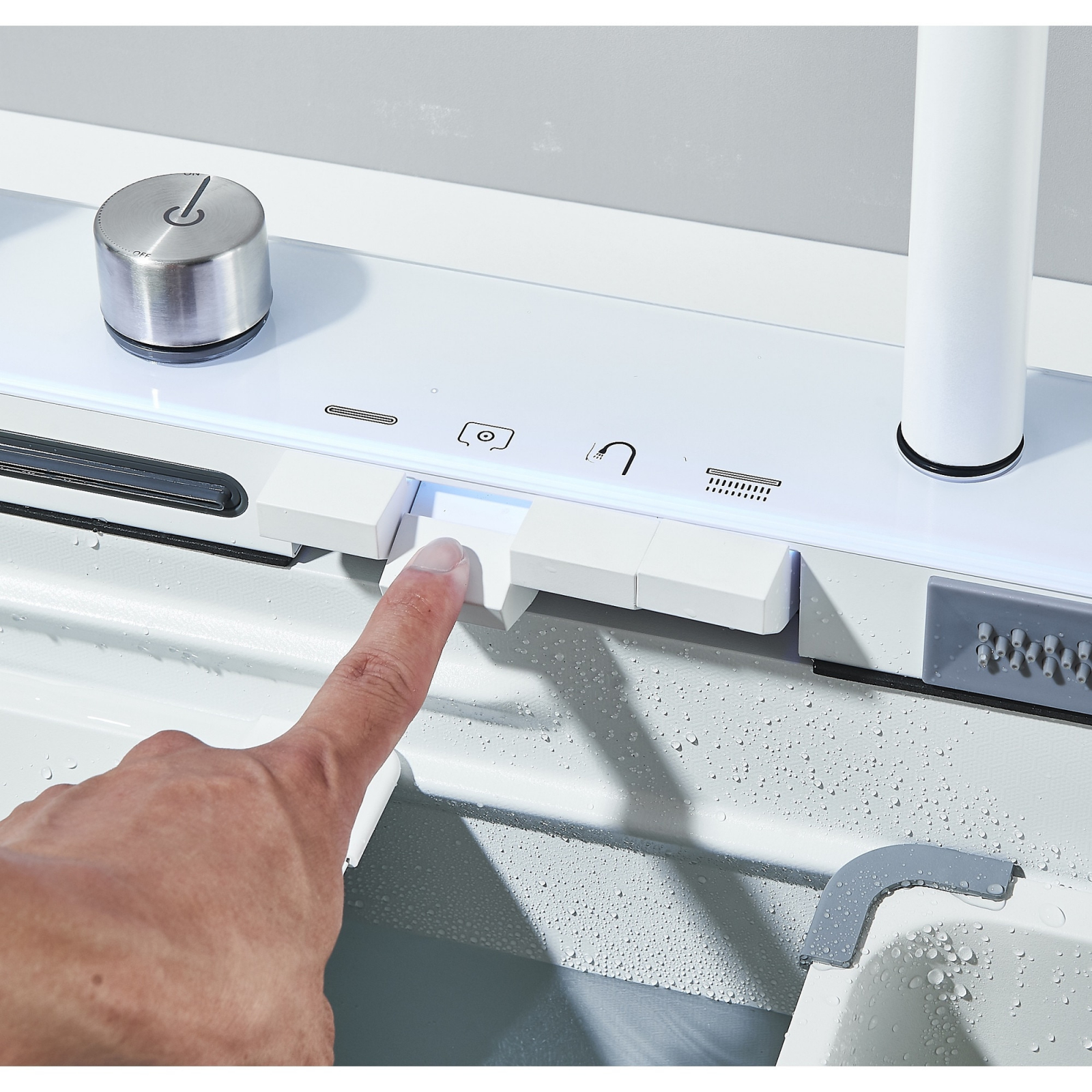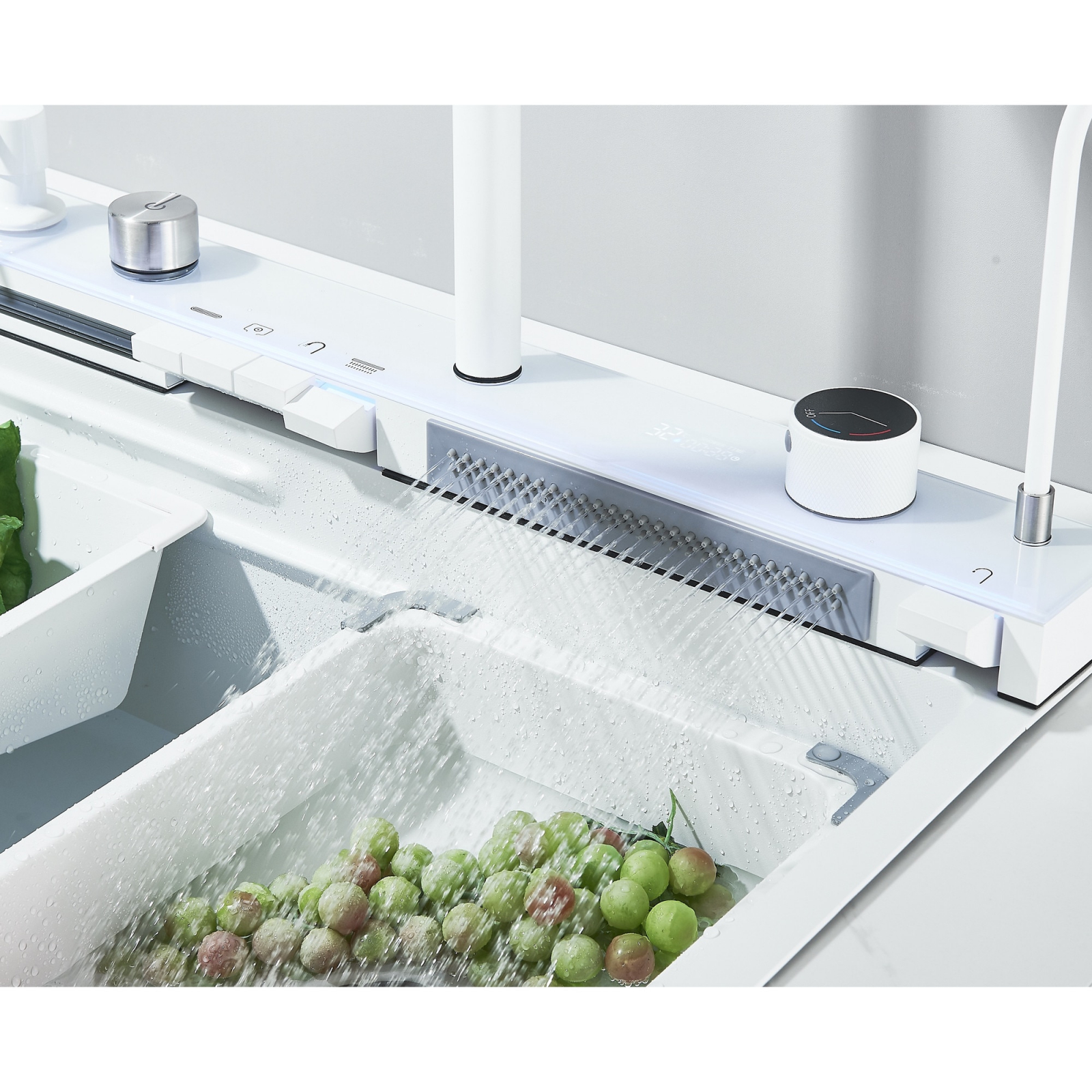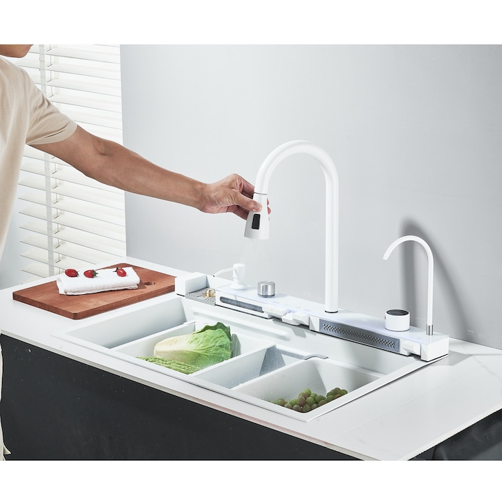 Instalarea este simplă, la nivelul blatului, iar dimensiunile de 750 x 460 mm (adâncime 220 mm) oferă un spațiu amplu și practic. Pachetul include accesorii premium: tocător ABS cu oțel, două tăvițe glisante, dispenser de săpun, spălător de pahare, baterie principală cu 3 moduri de curgere, baterie pentru apă filtrată și set complet de scurgere.