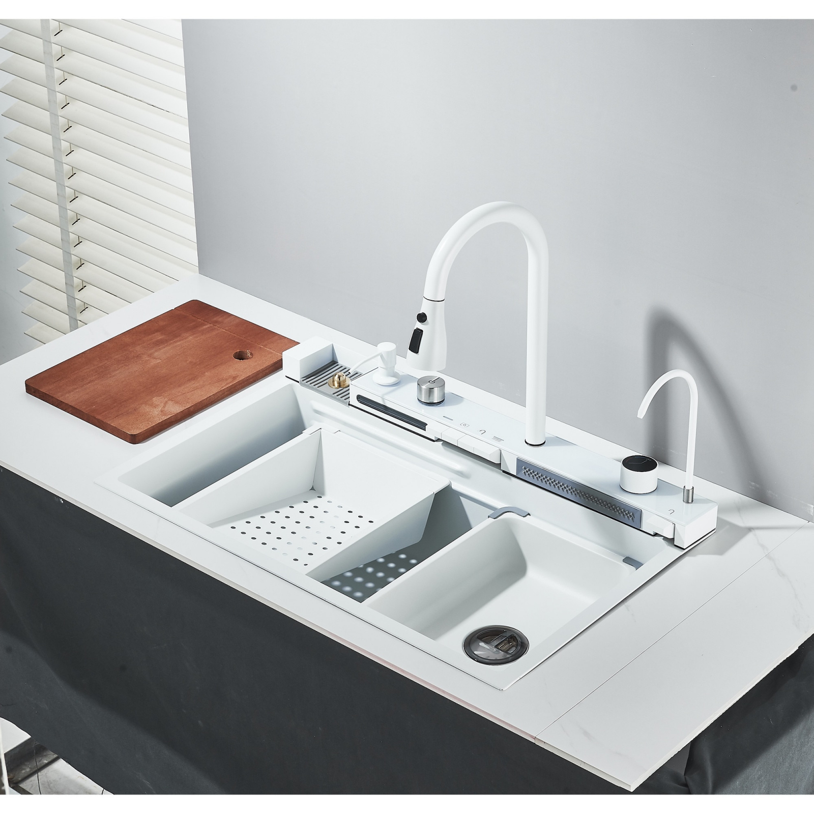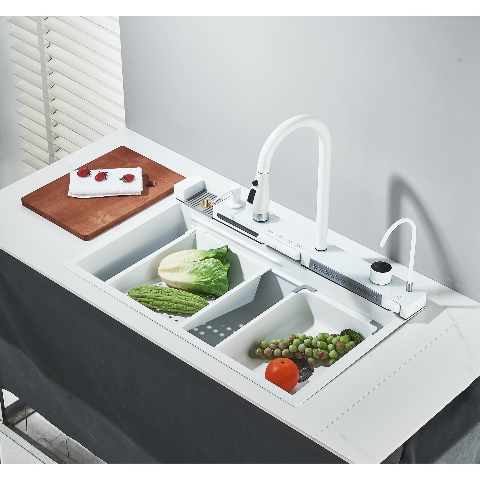Această chiuvetă multifuncțională cu finisaj alb mat îmbină designul modern cu funcționalitatea practică, transformând bucătăria într-un spațiu elegant și eficient. Cu un volum generos de 77 litri și un design dreptunghiular, este realizată din oțel rezistent, având o suprafață antiaderentă ce asigură o întreținere ușoară și o durabilitate crescută.