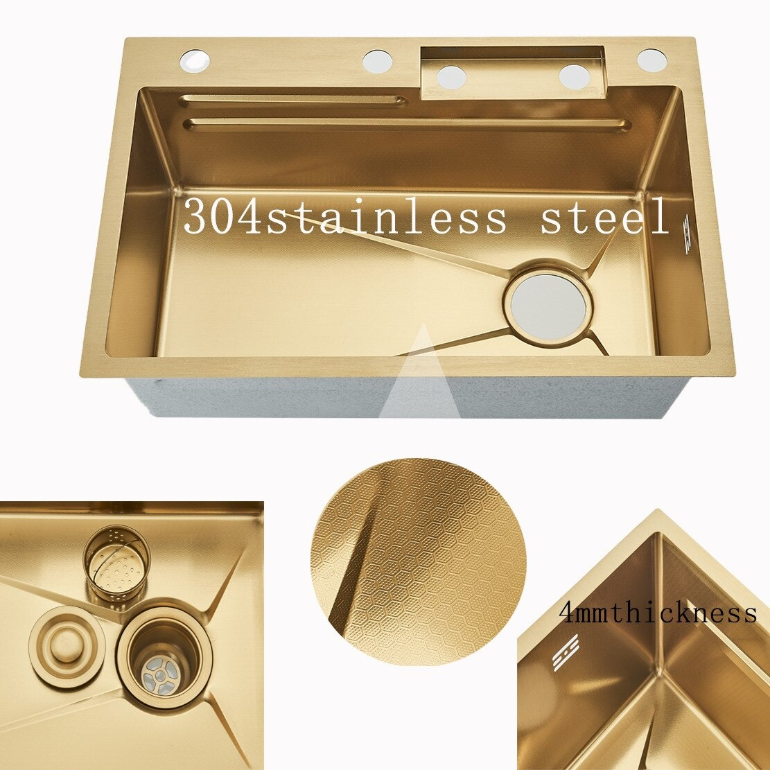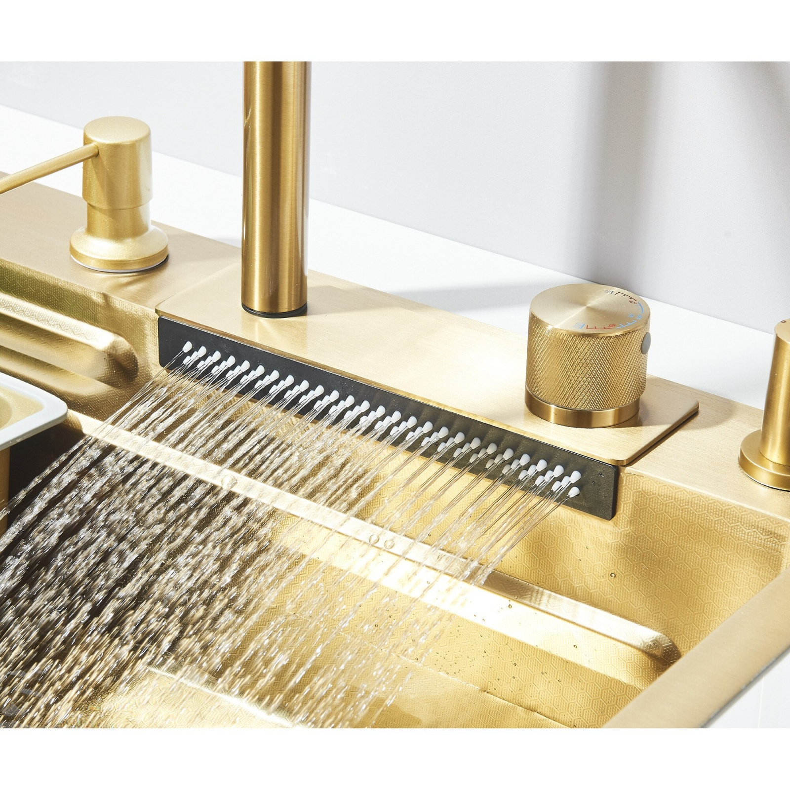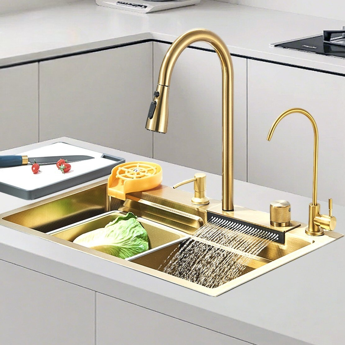 Aceasta chiuveta multifunctionala este dotata cu toate accesoriile necesare, inclusiv un dus extractabil si un tocator de abs plus otel, fiind ideala pentru orice bucatarie moderna. Cu un finisaj auriu mat si un design dreptunghiular, aceasta chiuveta ofera un volum generos, fiind fabricata din otel inoxidabil rezistent. Suprafata antiaderenta asigura intretinerea usoara si o durabilitate crescuta, perfecta pentru utilizarea zilnica.
