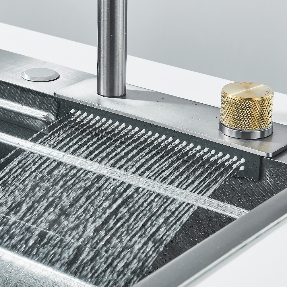 Instalarea se face ușor, la nivelul blatului, iar pachetul bogat de accesorii asigură o experiență completă: baterie principală cu trei moduri de curgere, tocător ABS/oțel, două tăvițe glisante, dispenser pentru săpun, baterie pentru apă filtrată și set complet de scurgere.