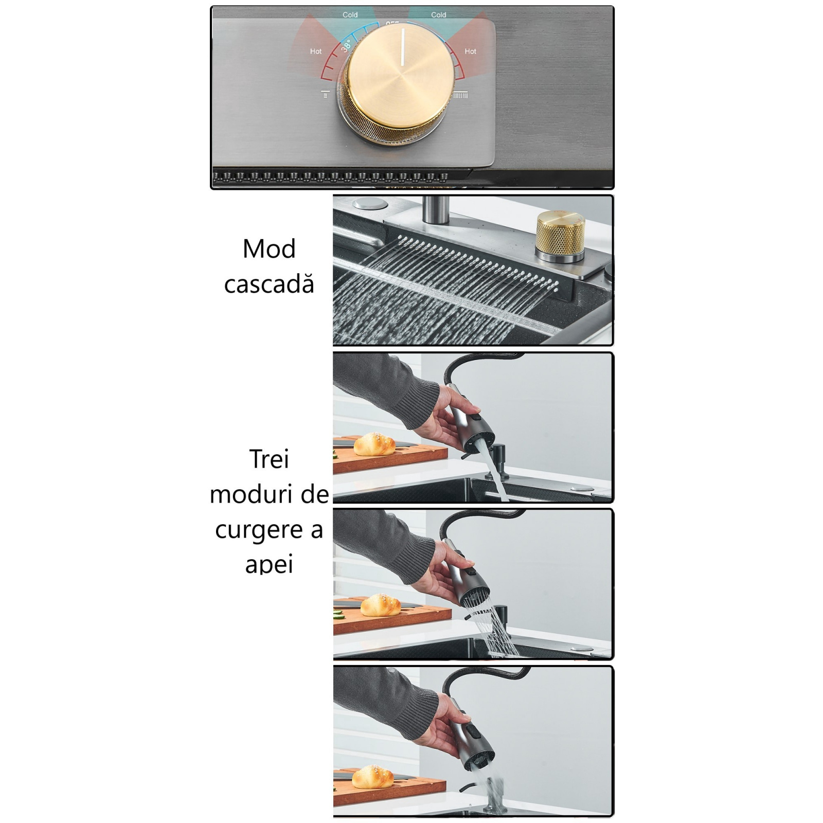 Caracteristici cheie: dimensiuni 600 x 450 mm, volum generos, finisaj gri grafit, suprafață antiaderentă, duș extractabil, funcție cascadă, pipă pivotantă 360°.