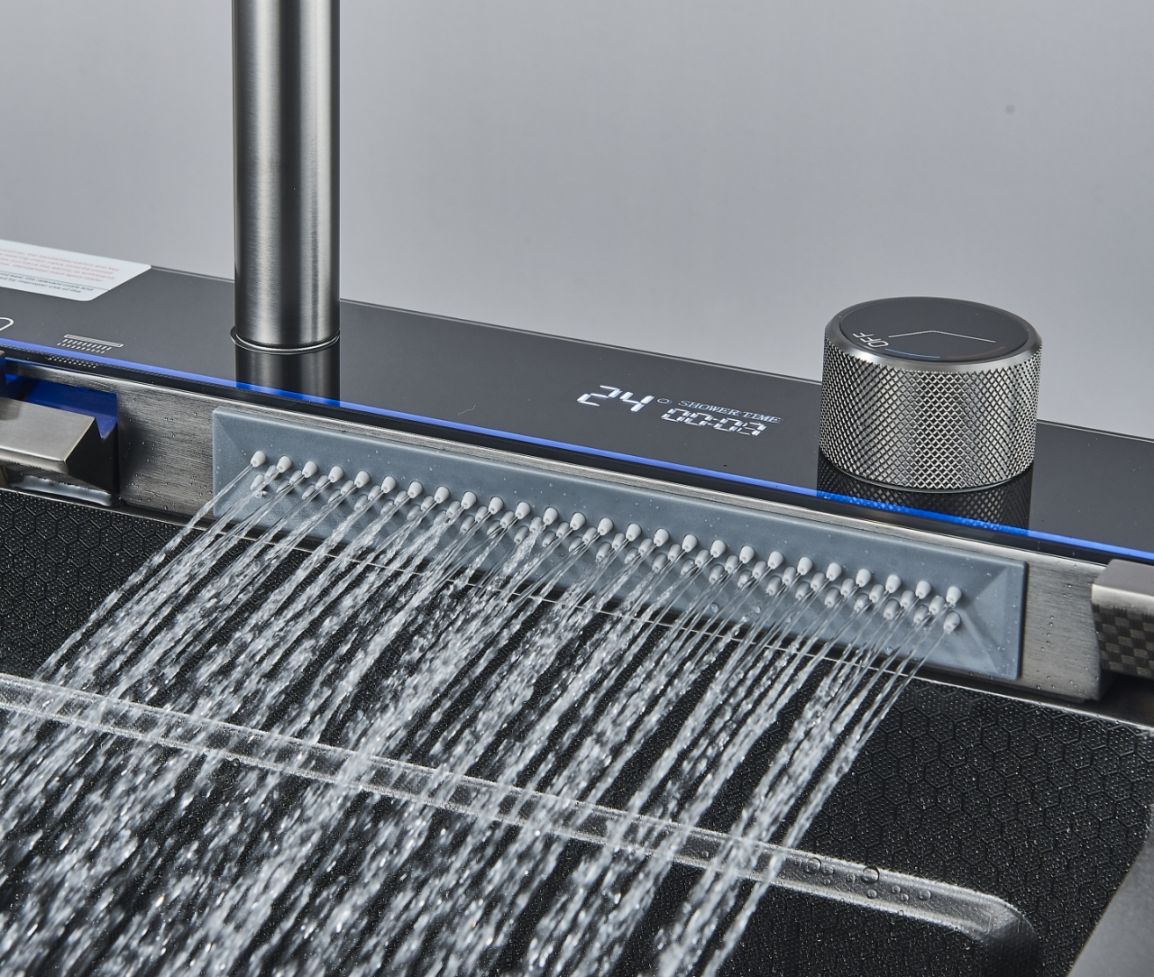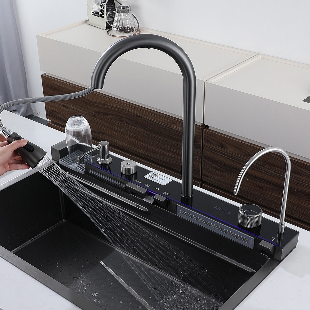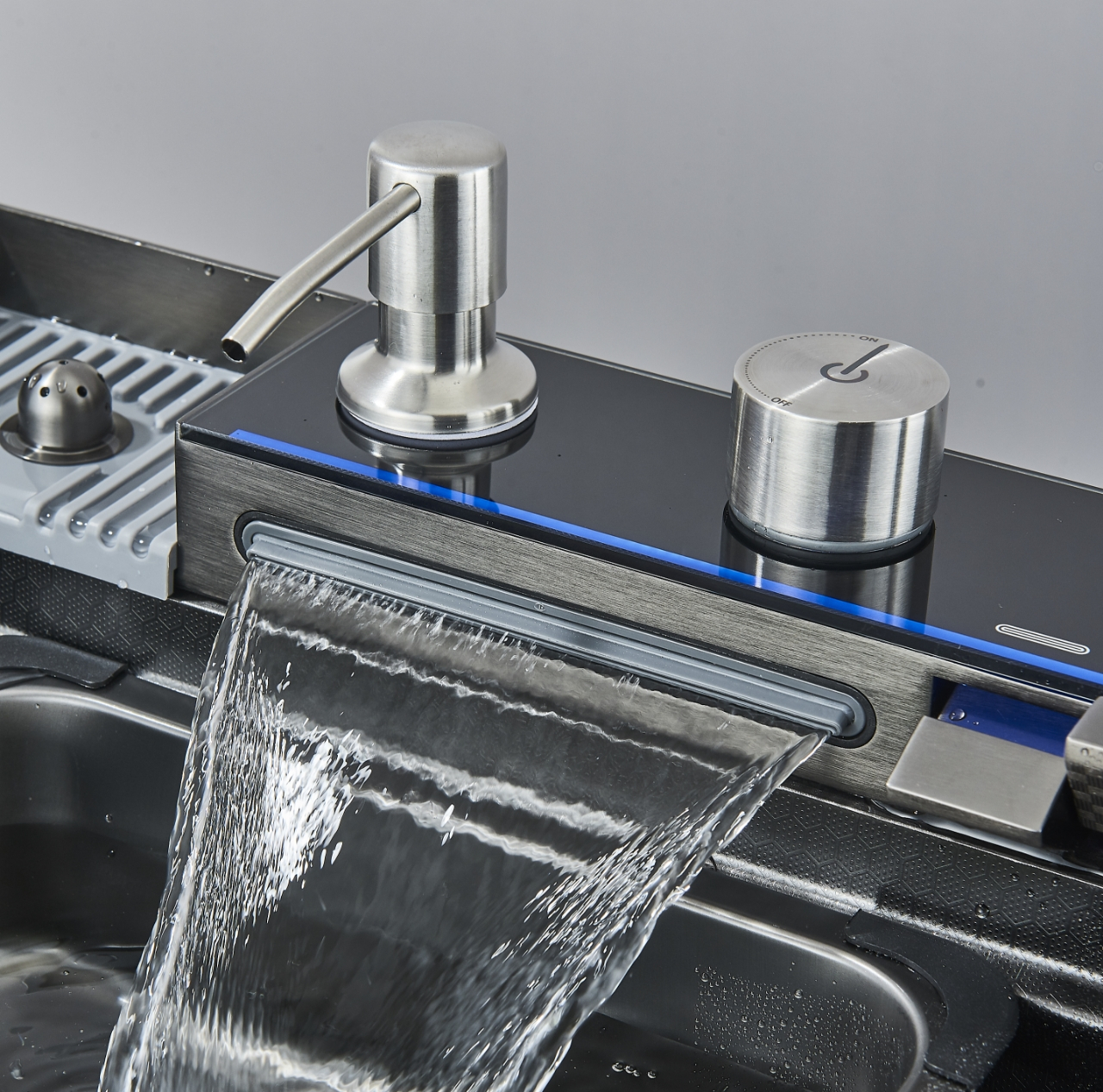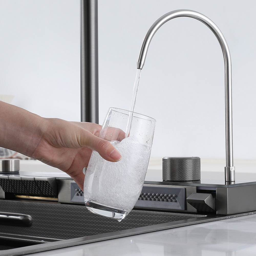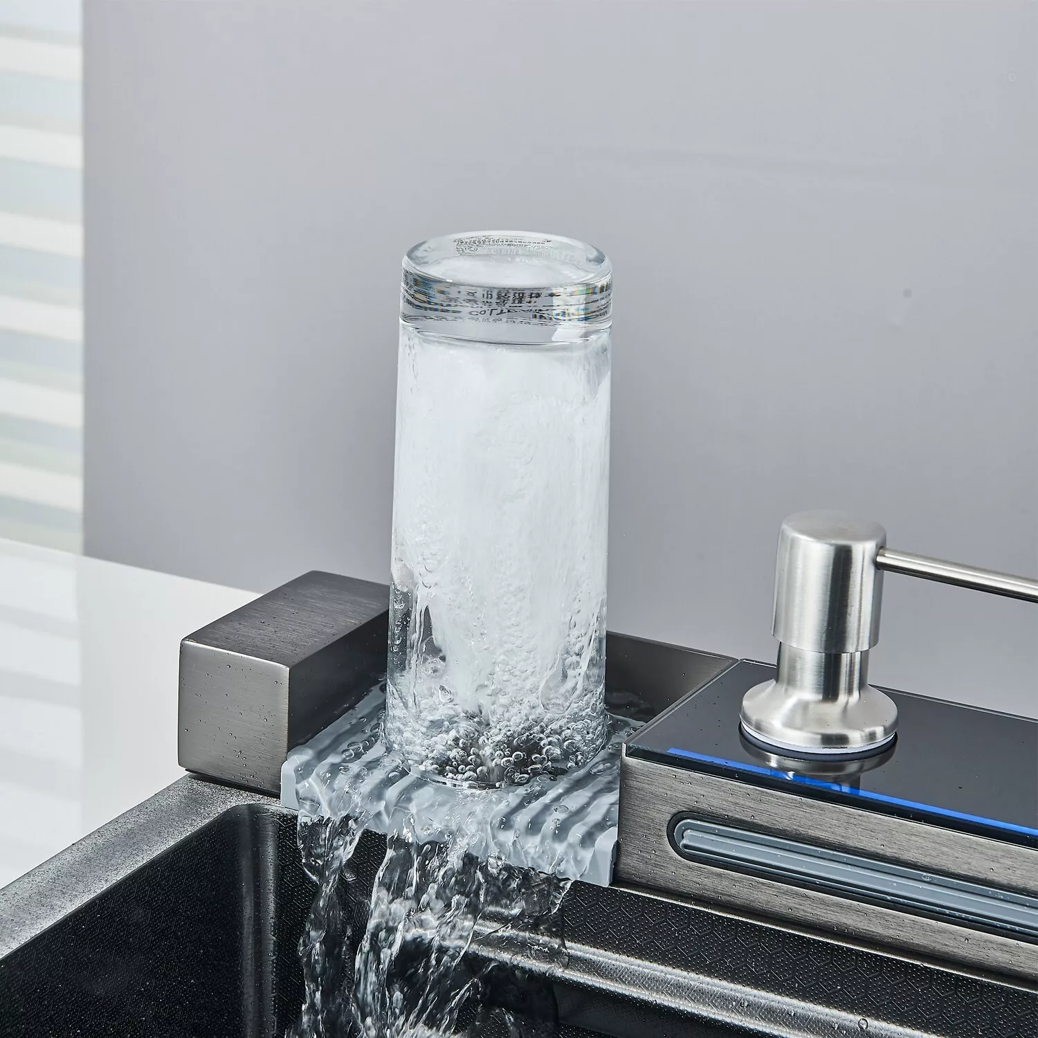 Chiuveta este echipată cu afișaj LCD pentru temperatura apei, un duș extractabil și două funcții de cascadă, care adaugă versatilitate și eleganță. Bateria pivotantă la 360° și sistemul de filtrare a apei completează experiența modernă de utilizare.