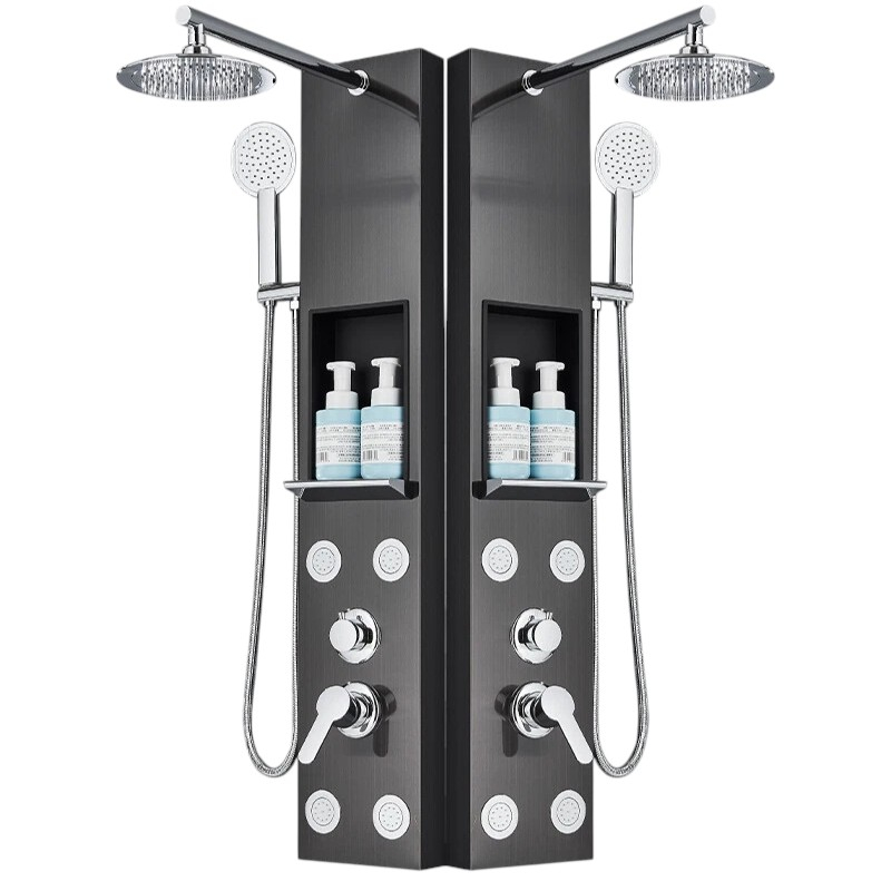 Coloana de Dus, Efect ploaie, Finisaj Negru Metalizat, Functii SPA cu Raft de Depozitare
