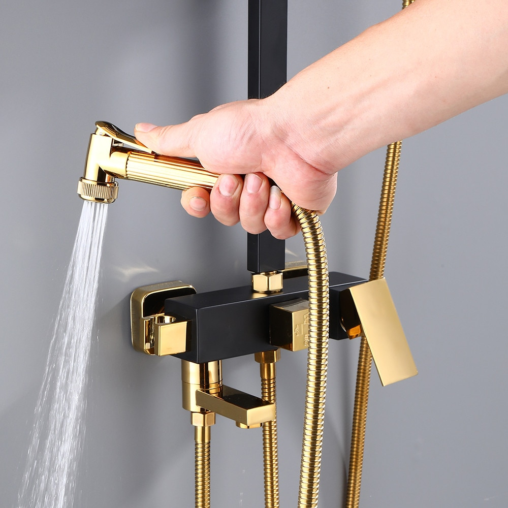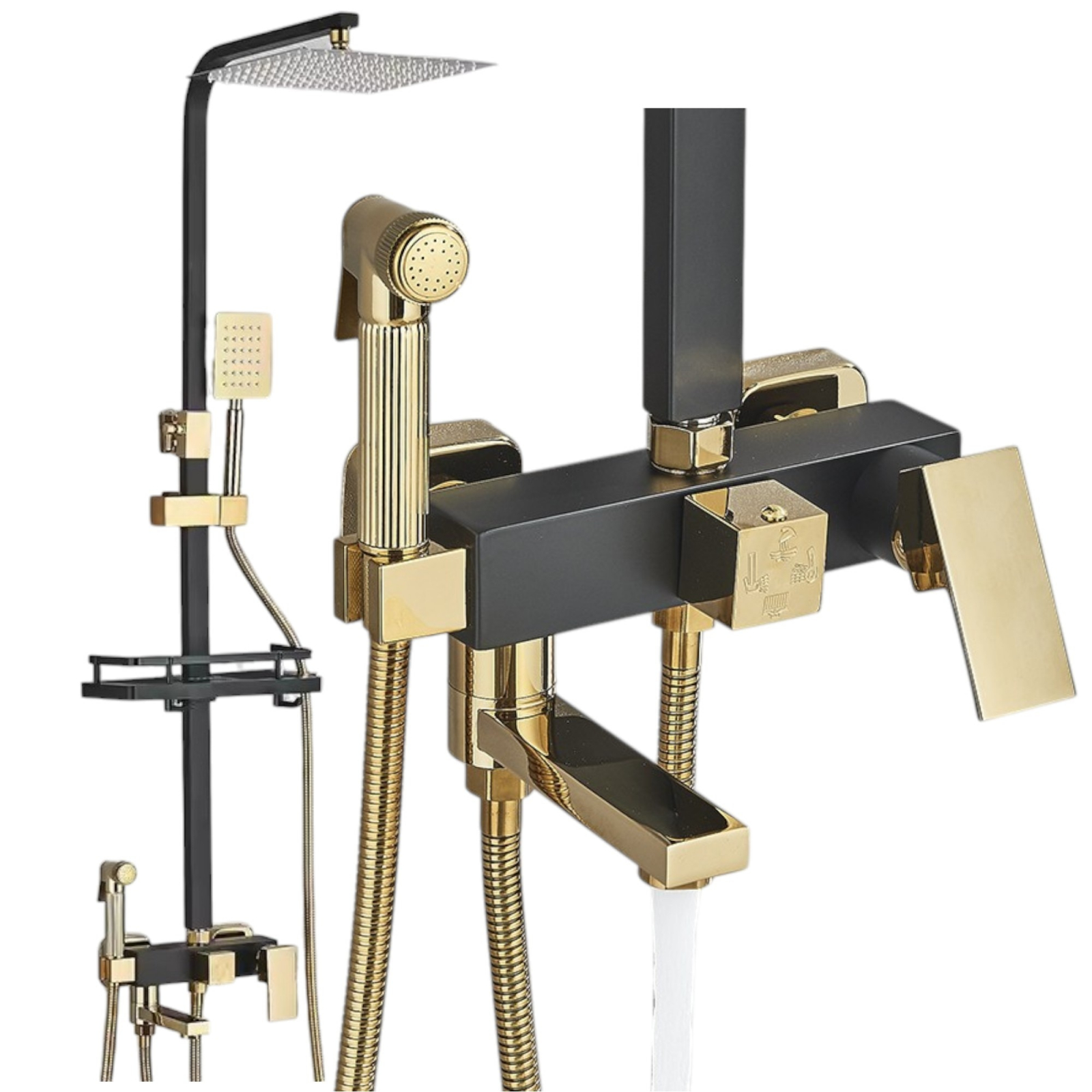 Coloană de duș baie, finisaj auriu lucios/negru mat, cu pălărie tip ploaie 25 cm, 4 funcții de curgere și robinet pivotant 180°. Reglabilă pe înălțime (73–116 cm), realizată din alamă solidă cu suprafață durabilă anti-amprente.