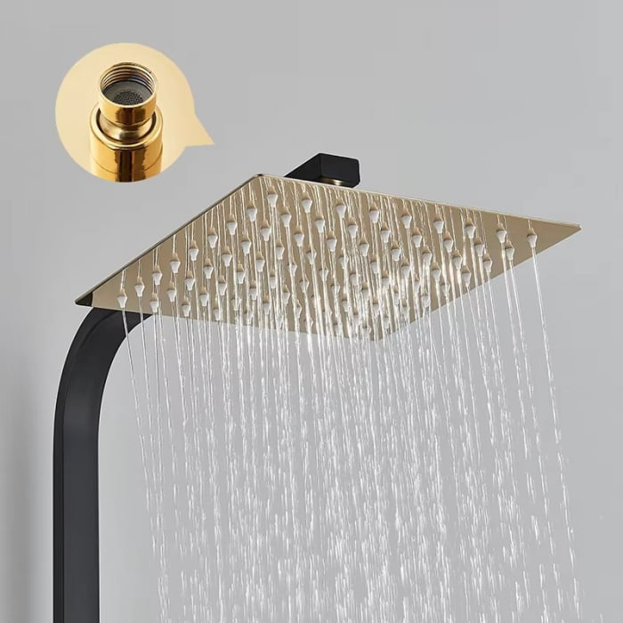 Această coloană de duș cu finisaj auriu lucios/negru mat este alegerea perfectă pentru cei care doresc să adauge un plus de eleganță și funcționalitate băii lor. Cu un design modern și o pălărie de duș de 25 cm tip ploaie, transformă fiecare utilizare într-o experiență relaxantă și rafinată.