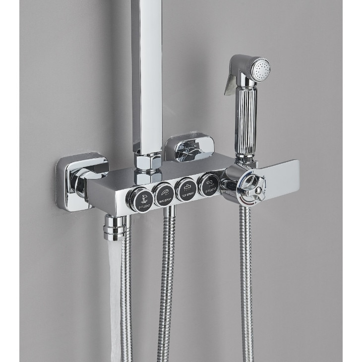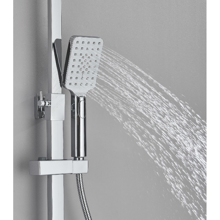 Funcționalitatea este adaptată nevoilor moderne: coloana de duș oferă patru funcții de curgere – para fixă tip ploaie, para de duș manuală, duș igienic și pipă pentru umplerea căzii. Selectarea modului de curgere se face simplu, prin robinetul amplasat în partea inferioară a bateriei. În plus, coloana este reglabilă pe înălțime (83 – 120 cm), asigurând confort și adaptabilitate pentru orice utilizator.