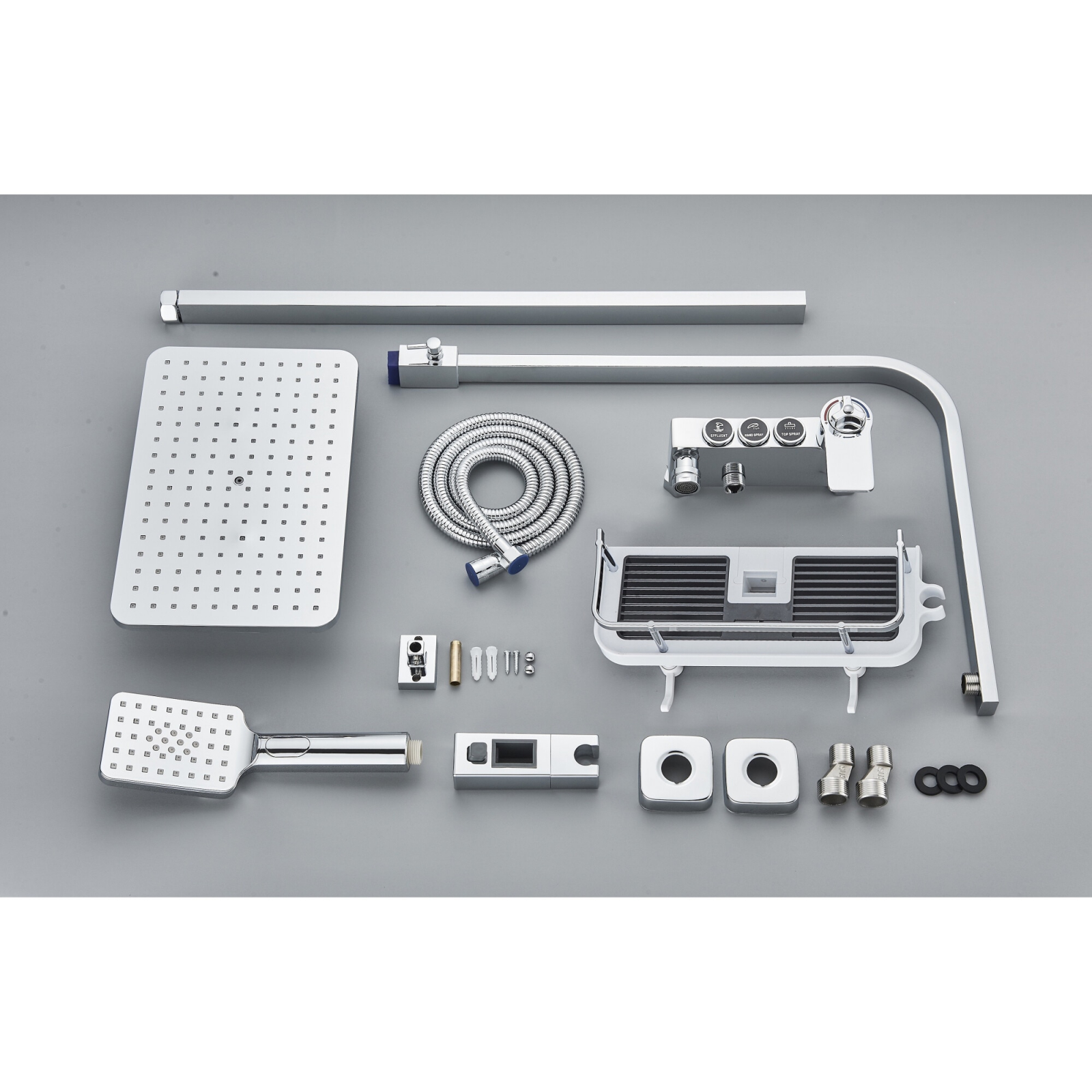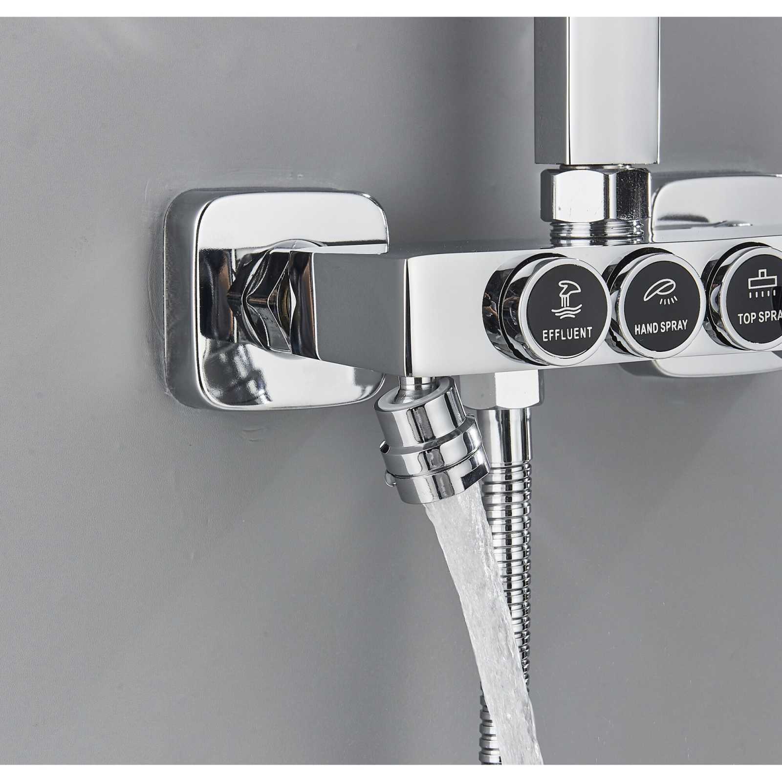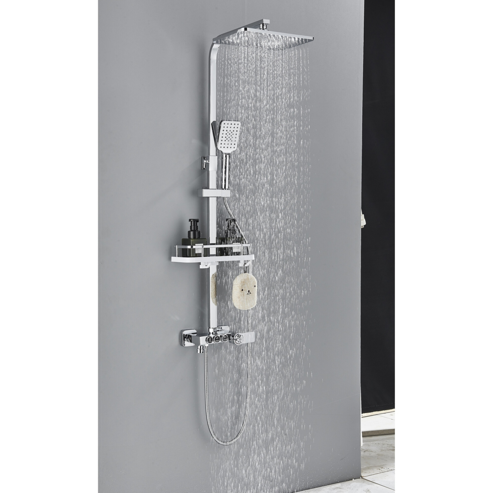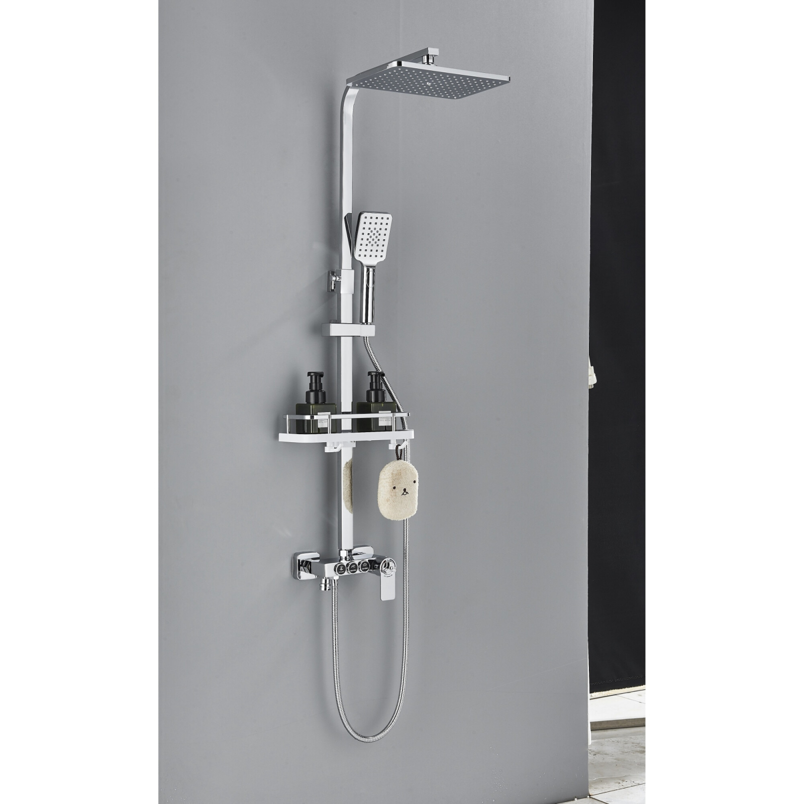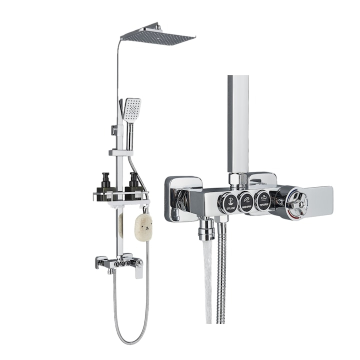 Caracteristici cheie: finisaj crom lucios premium, termostat pentru controlul temperaturii, 3 funcții de curgere (duș fix, duș de mână, igienic), pălărie de duș 30 cm, înălțime reglabilă 83–120 cm, construcție din alamă solidă și ABS durabil, cos organizator inclus.
