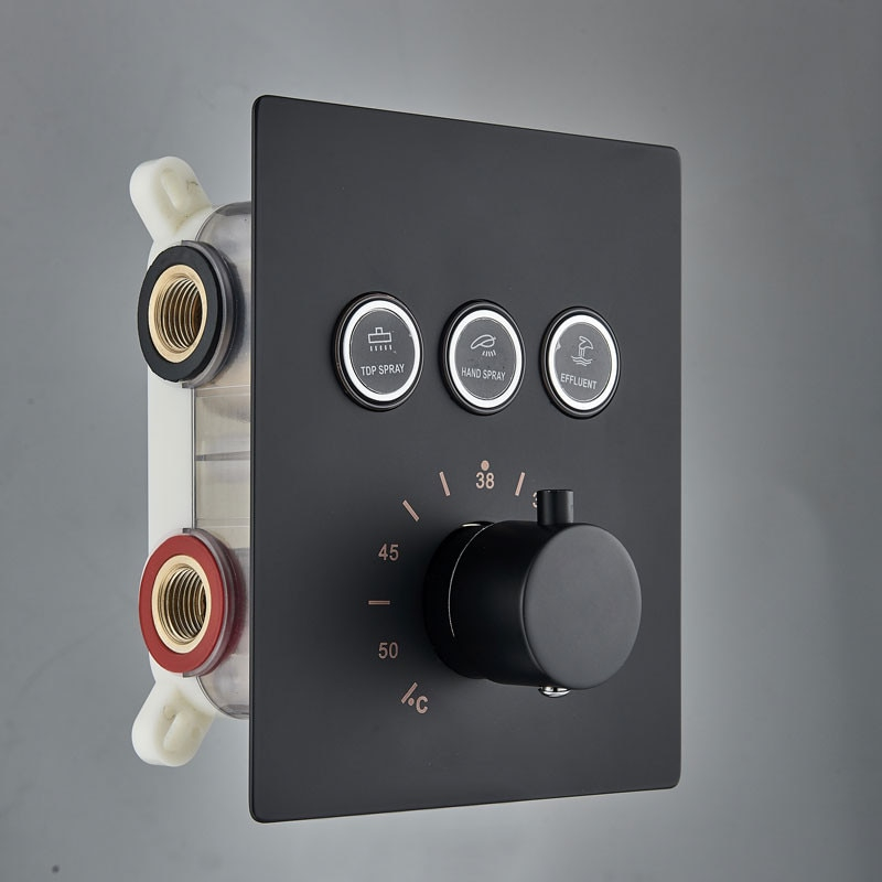 Sistem de duș încastrabil, finisaj negru mat, cu para tavan 40 x 80 cm cu LED, 3 funcții de curgere (ploaie, cascadă, duș de mână) și termostat. Realizat din alamă solidă, cu funcționare optimă la presiune minimă 0,05 MPa.