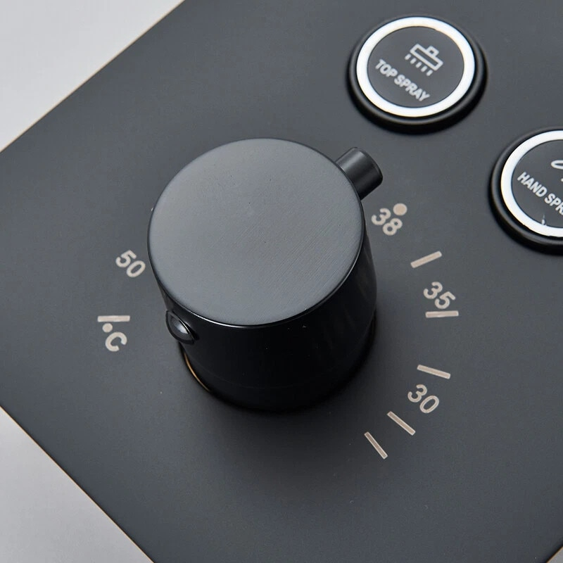 Transformă baia într-un spațiu de relaxare modern cu acest sistem de duș încastrabil cu termostat și funcție SPA, ce îmbină eleganța finisajului negru mat cu performanța tehnică.