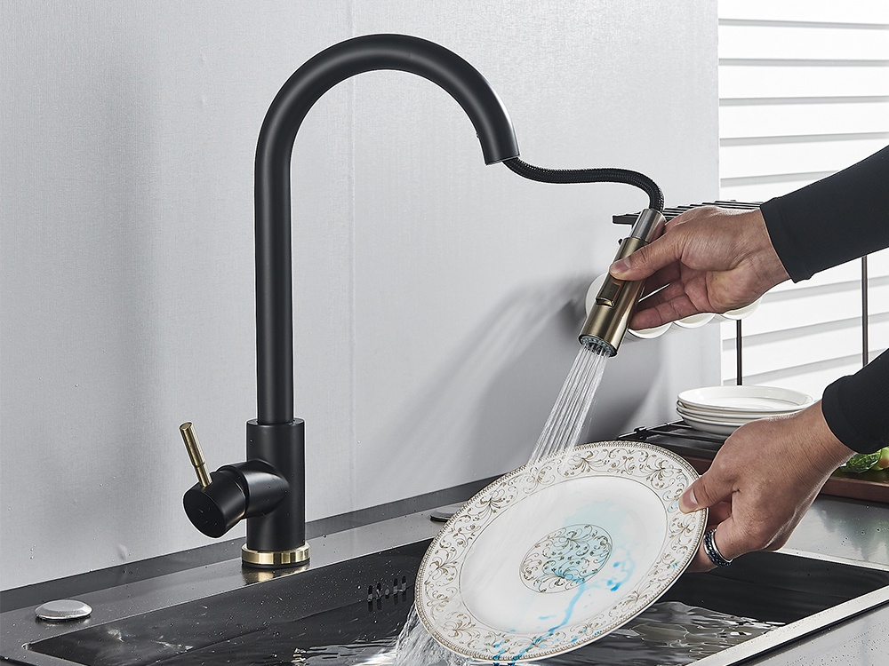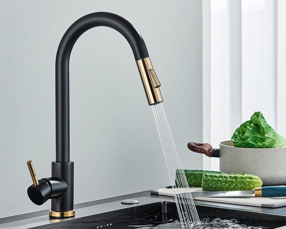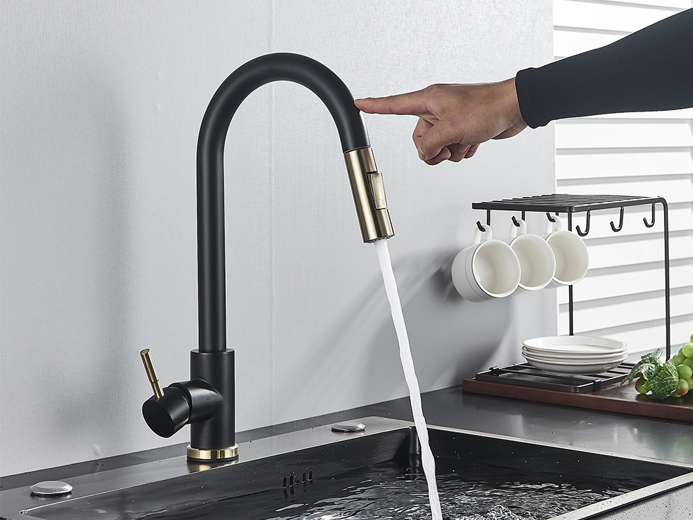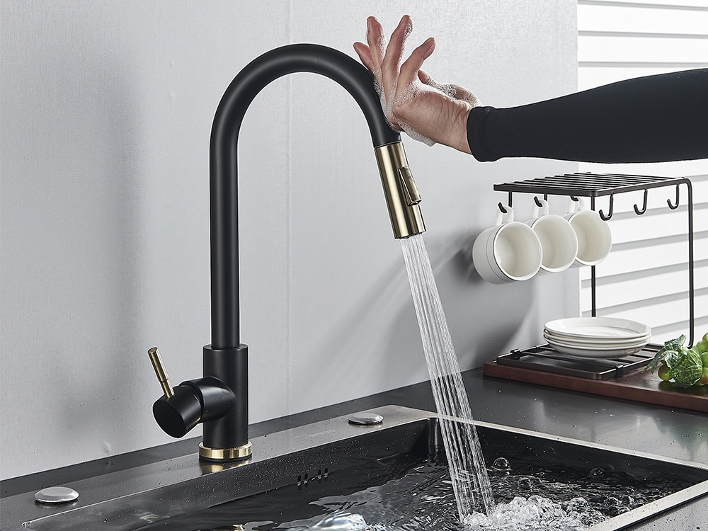 Baterie Chiuvetă Bucătărie – Finisaj Negru Mat & Auriu, Funcție Touch și Duș Extractabil