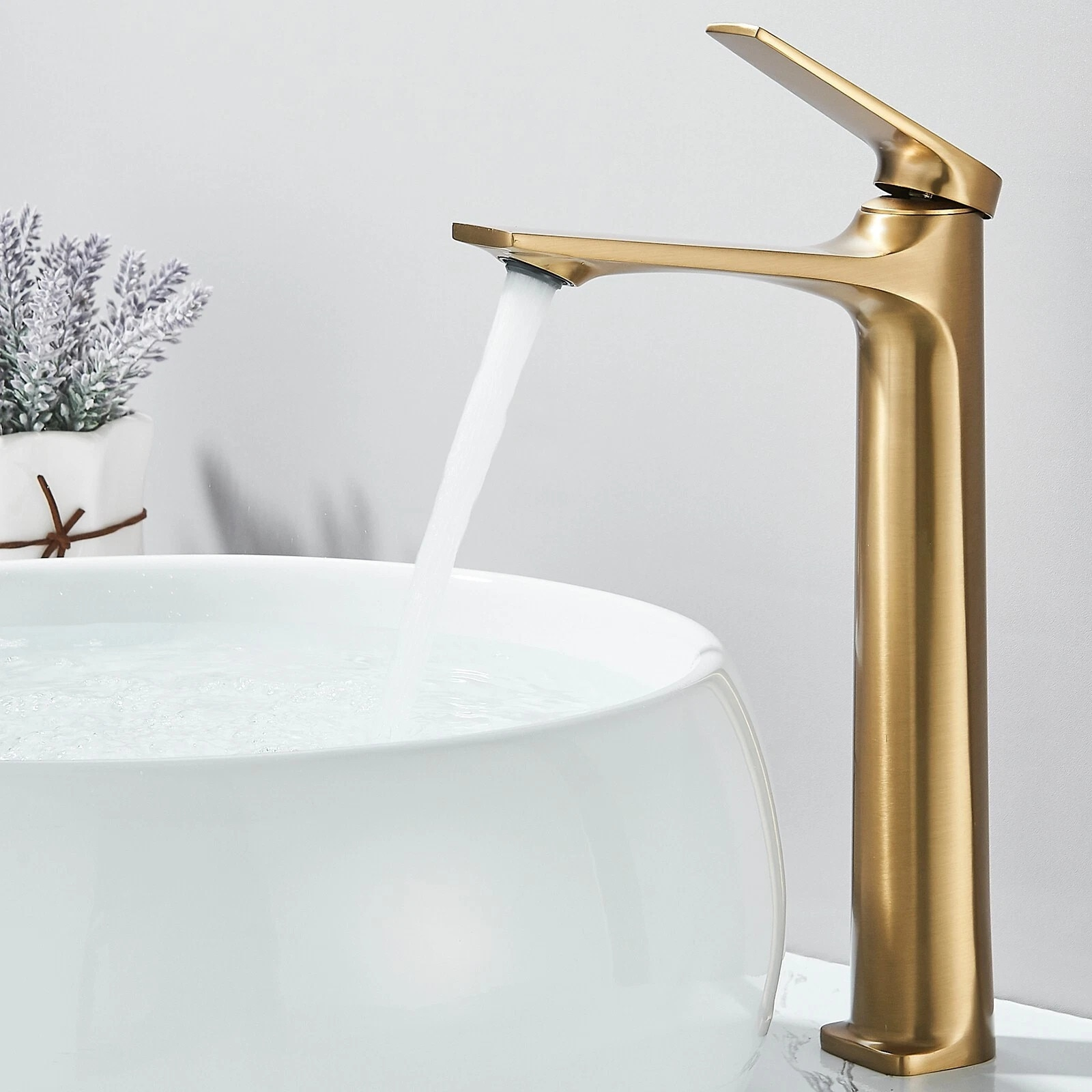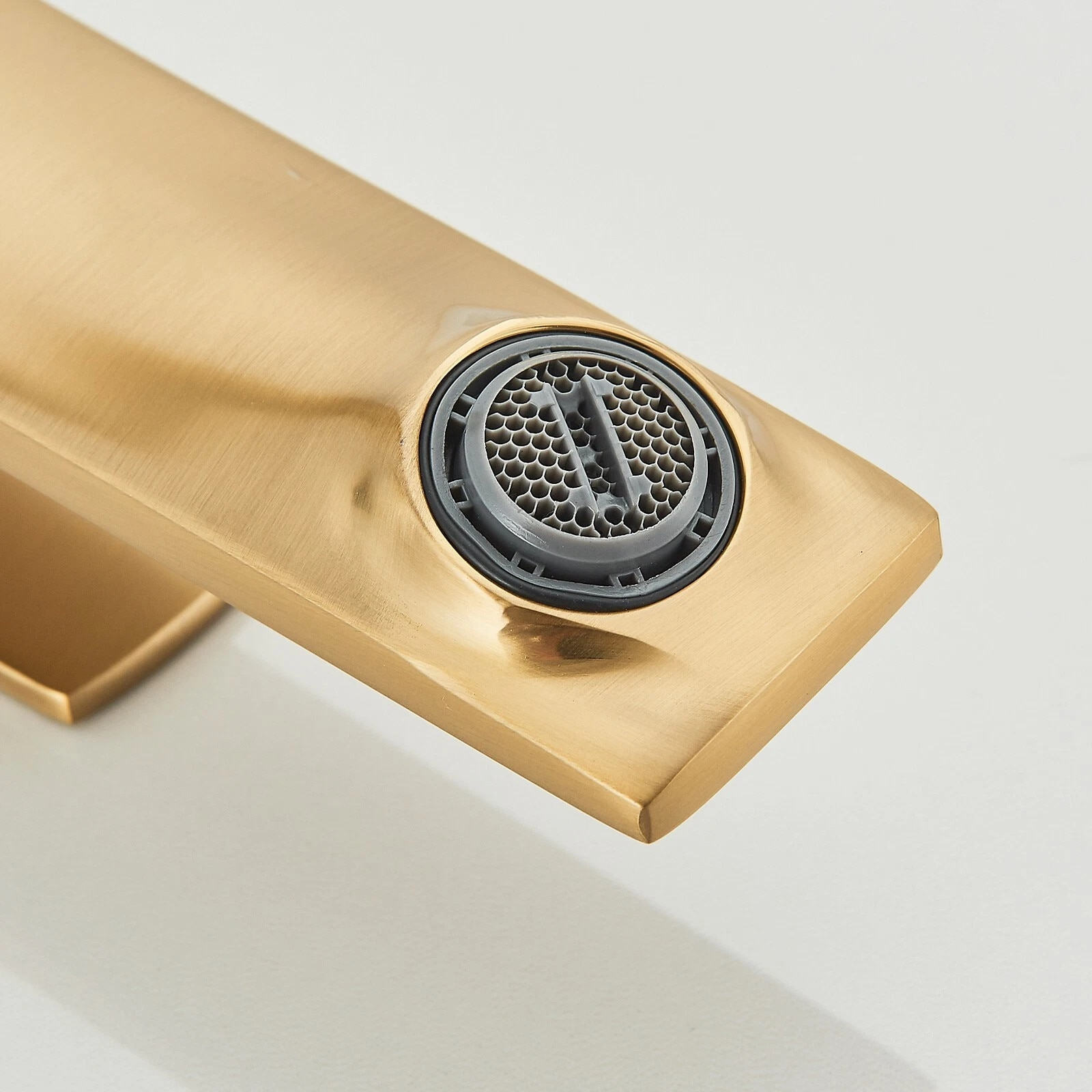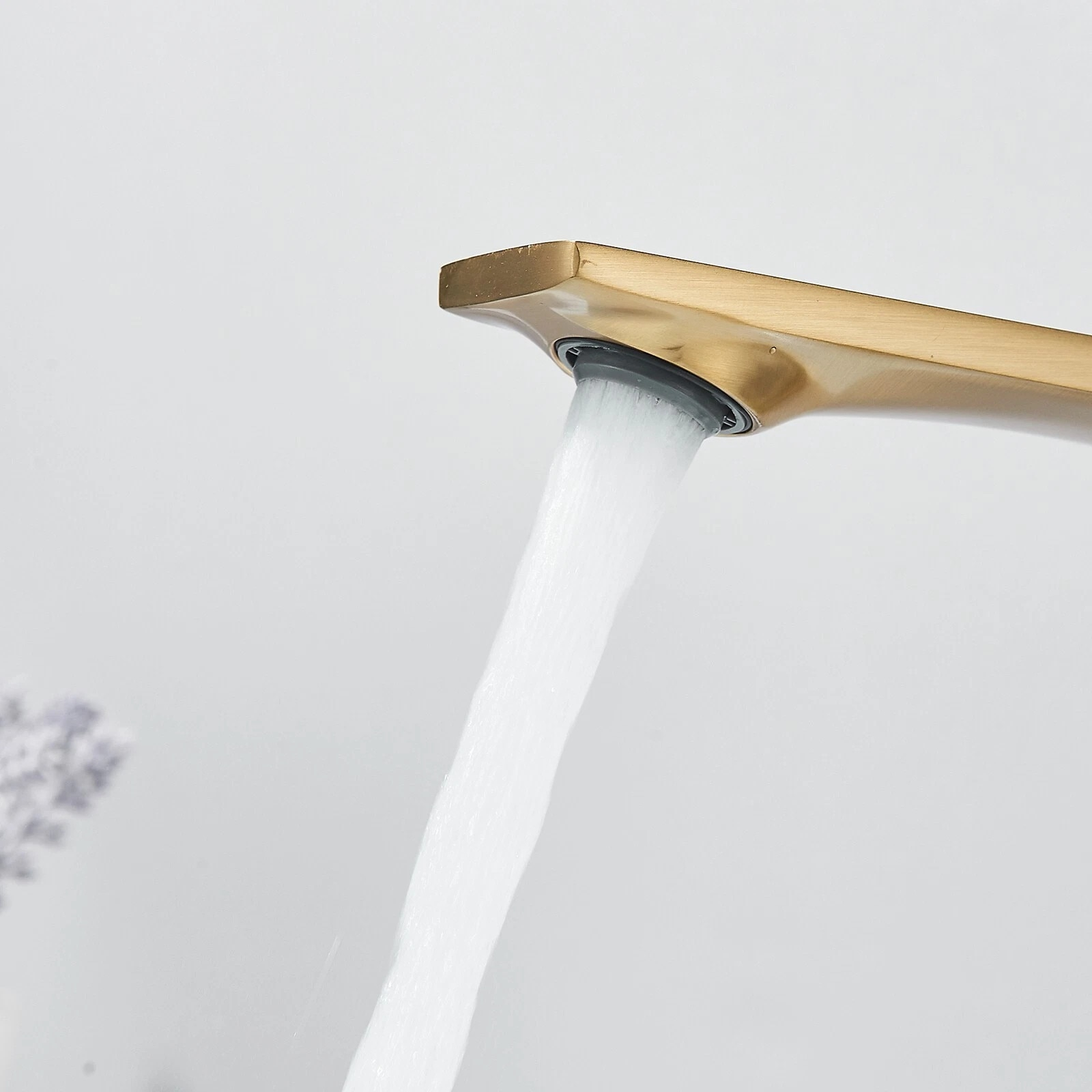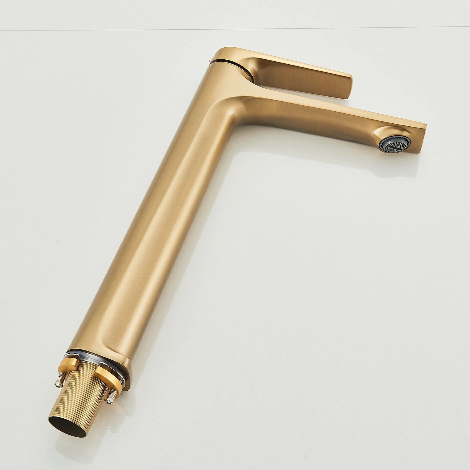 Caracteristici cheie: construcție din alamă solidă cu strat rezistent la coroziune și uzură, dimensiune de 31 cm potrivită pentru băi moderne, operare cu o singură mână și comutator pentru apă caldă/rece, pipă înclinată la 15° pentru flux uniform și economie de apă, stil elegant cu finisaj auriu mat.