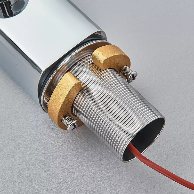 Finisajul crom lucios combinat cu elemente din sticlă oglindă oferă un aspect luxos, transformând bateria într-un punct central al băii.