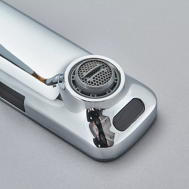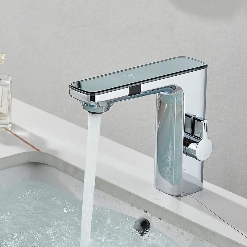 Baterie Chiuvetă Baie BisDesign® – Display Digital, Sticlă Oglindă, Două Moduri de Curgere, Finisaj Crom Lucios, 14 cm