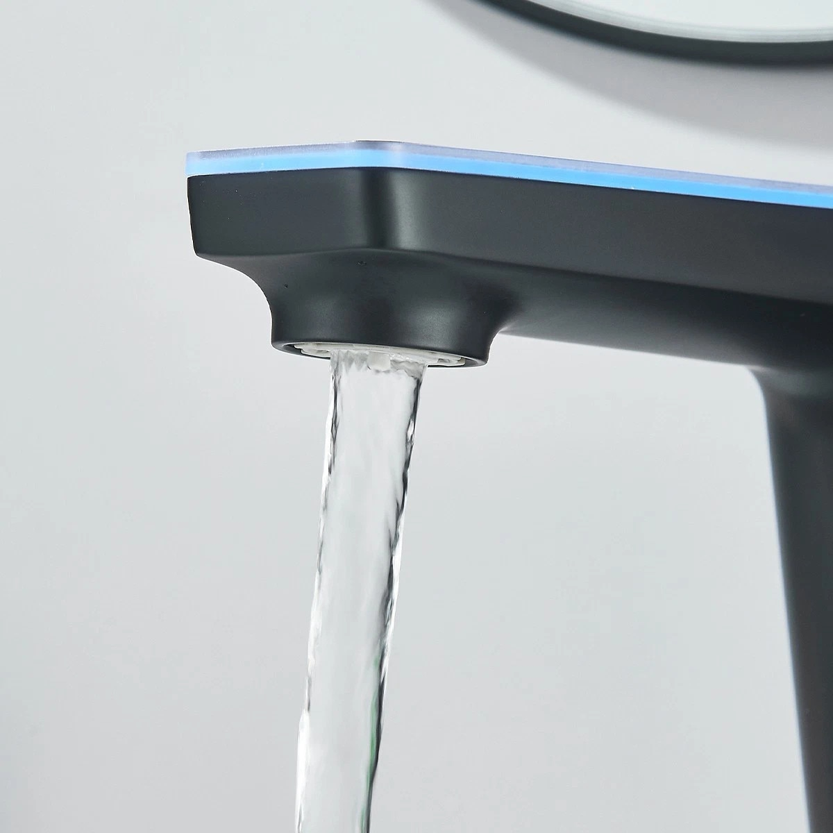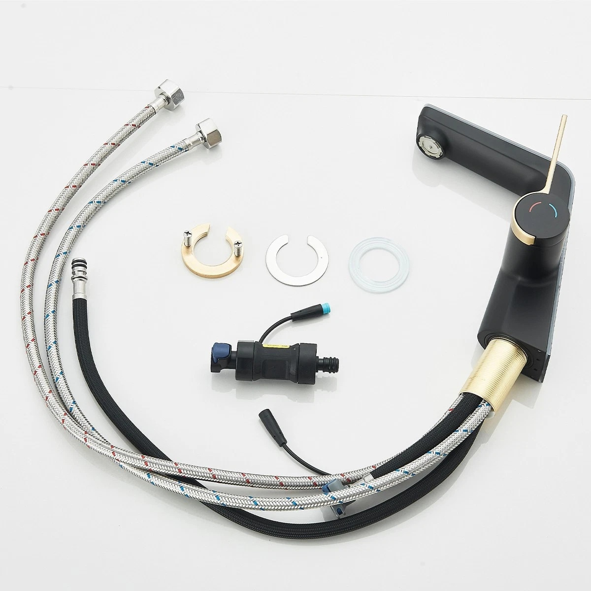 Baterie Chiuvetă Baie BisDesign® – Finisaj Negru Mat cu Accente Aurii, Display Digital și Bandă LED Tricoloră, 17 cm