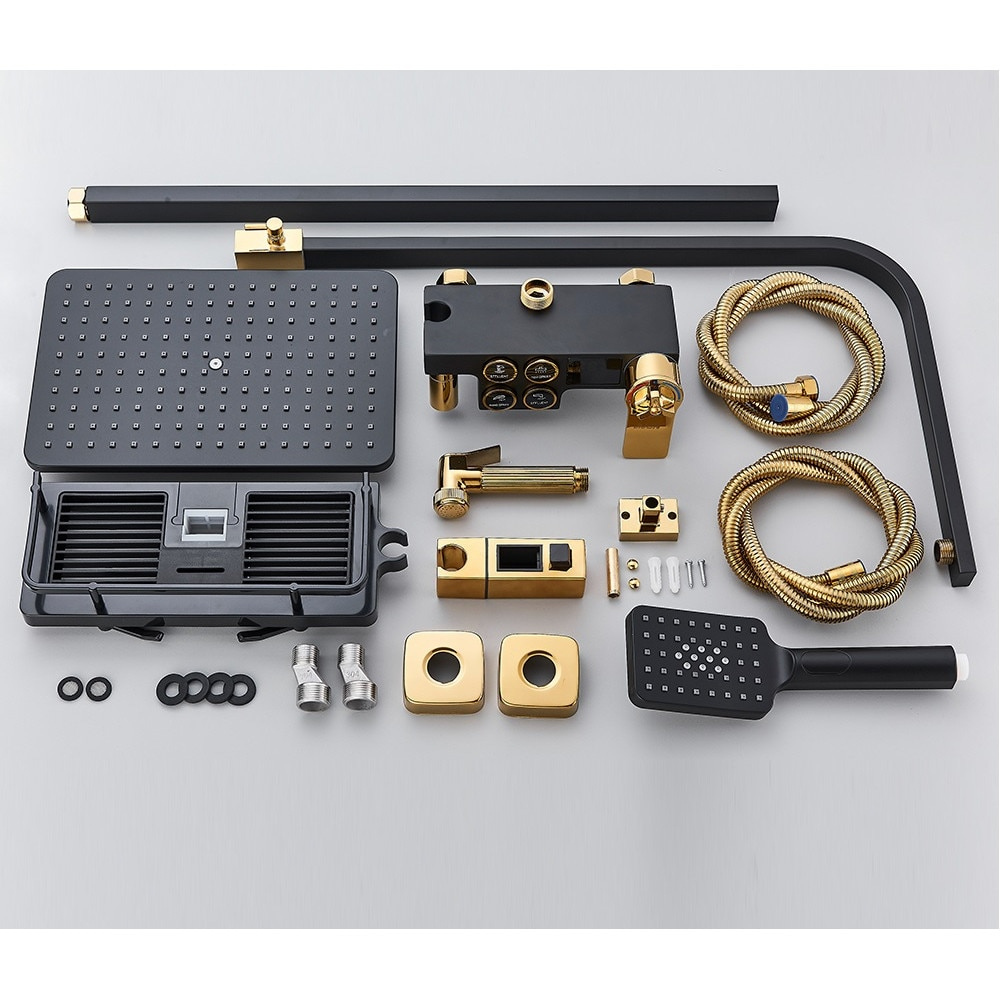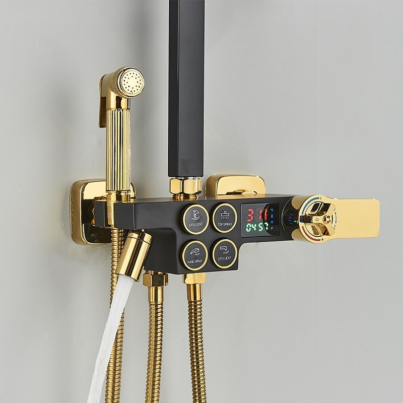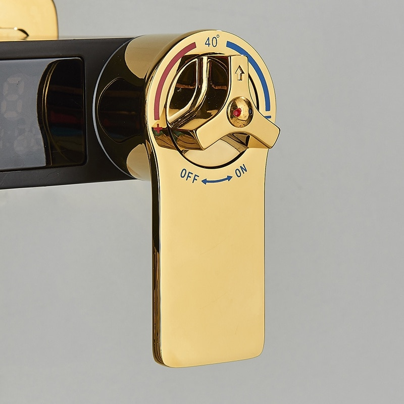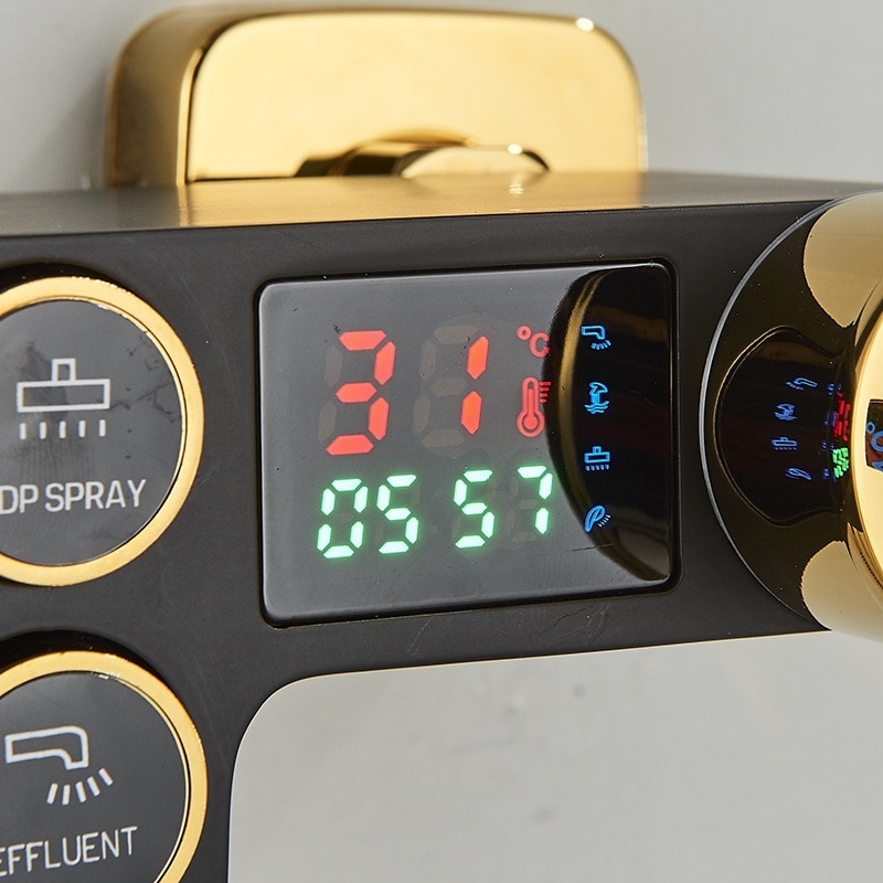 Această coloană de duș baie, cu termostat și display LCD, finisaj auriu lucios/negru mat, îmbină tehnologia modernă cu designul sofisticat, aducând un plus de confort și eleganță în orice baie. Pălăria de duș de 30 cm cu efect ploaie oferă o experiență relaxantă, asemănătoare unei sesiuni de spa.