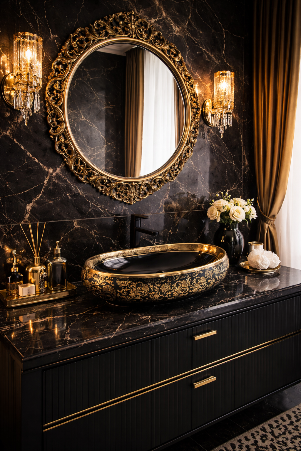 Lavoar de baie pe blat BisDesign®, realizat din ceramică sanitară premium, cu finisaj negru lucios și decor auriu elegant, în stil luxury. Forma ovală și detaliile ornamentale oferă un aspect sofisticat, iar ventilul ceramic de scurgere inclus completează perfect designul. Ideal pentru băi exclusiviste și amenajări statement.