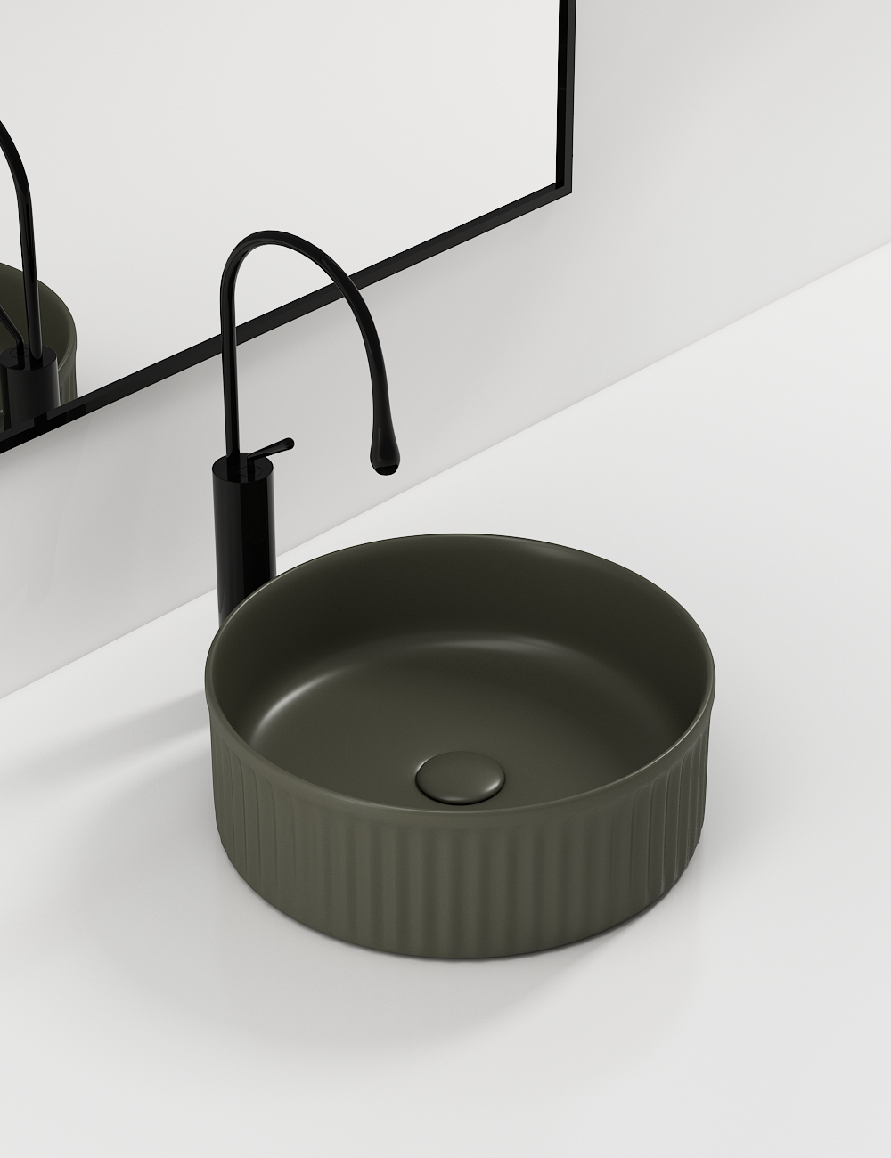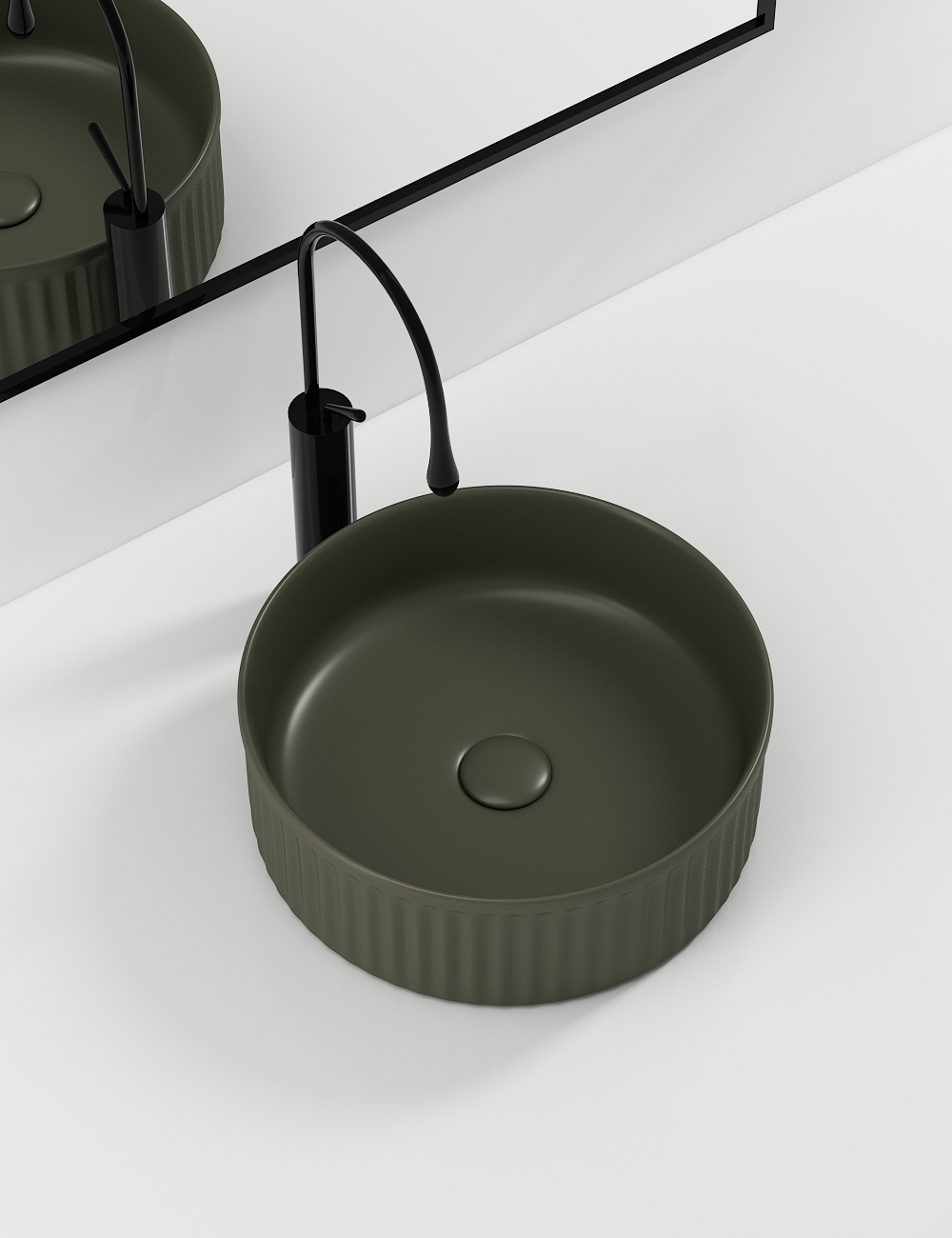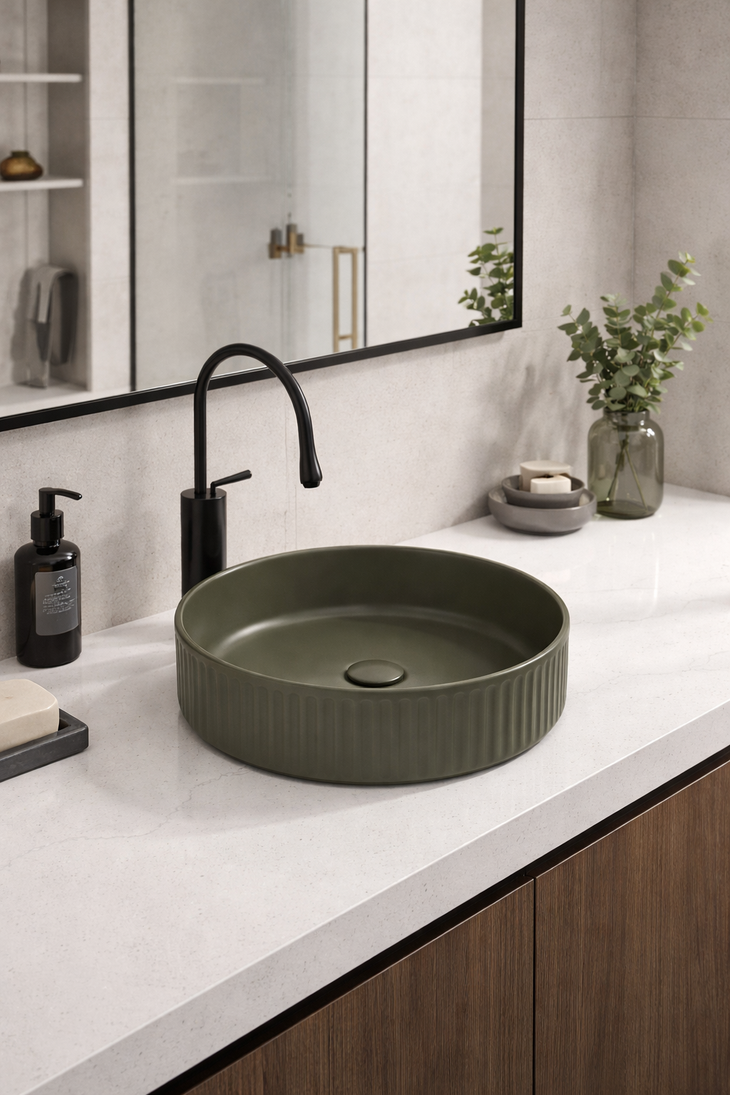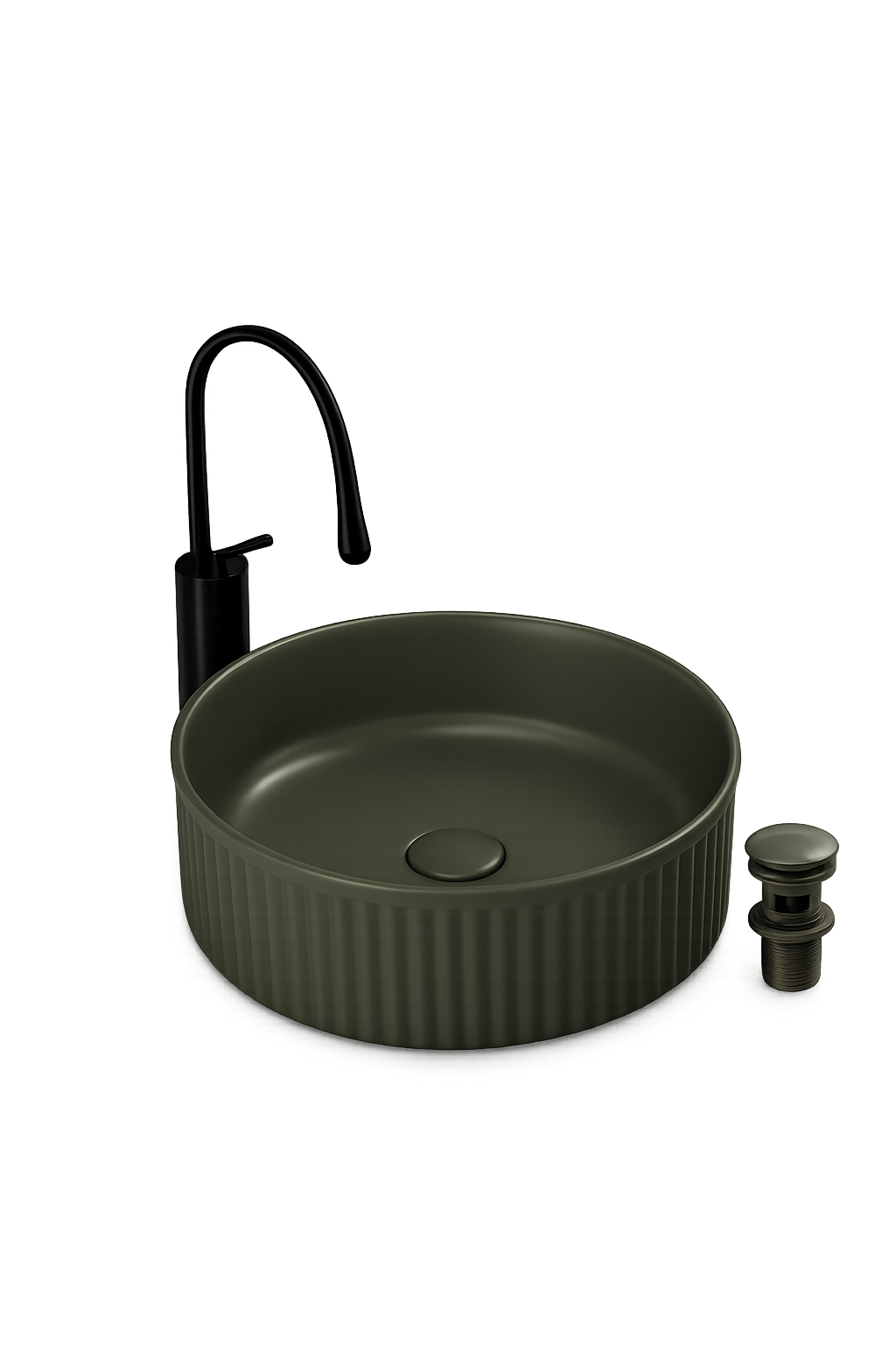 Lavoar de baie pe blat BisDesign®, realizat din ceramică sanitară premium, cu finisaj verde olive mat și design modern cu striații verticale elegante. Forma rotundă și textura exterioară oferă un aspect contemporan, natural și echilibrat, ideal pentru băi moderne, minimaliste sau inspirate din natură. Ventilul ceramic inclus, asortat cromatic, completează perfect designul unitar.